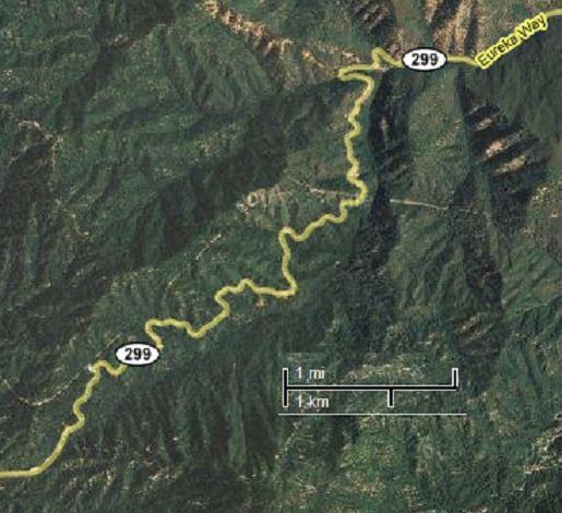 299 was a 3rd and 4th gear dragon, most corners between 35 and 50, a few tight switchbacks... if you take all of 299, it's several hours of twistys, but the section in the pic is about 8 miles or so, and luckily was a clean run...