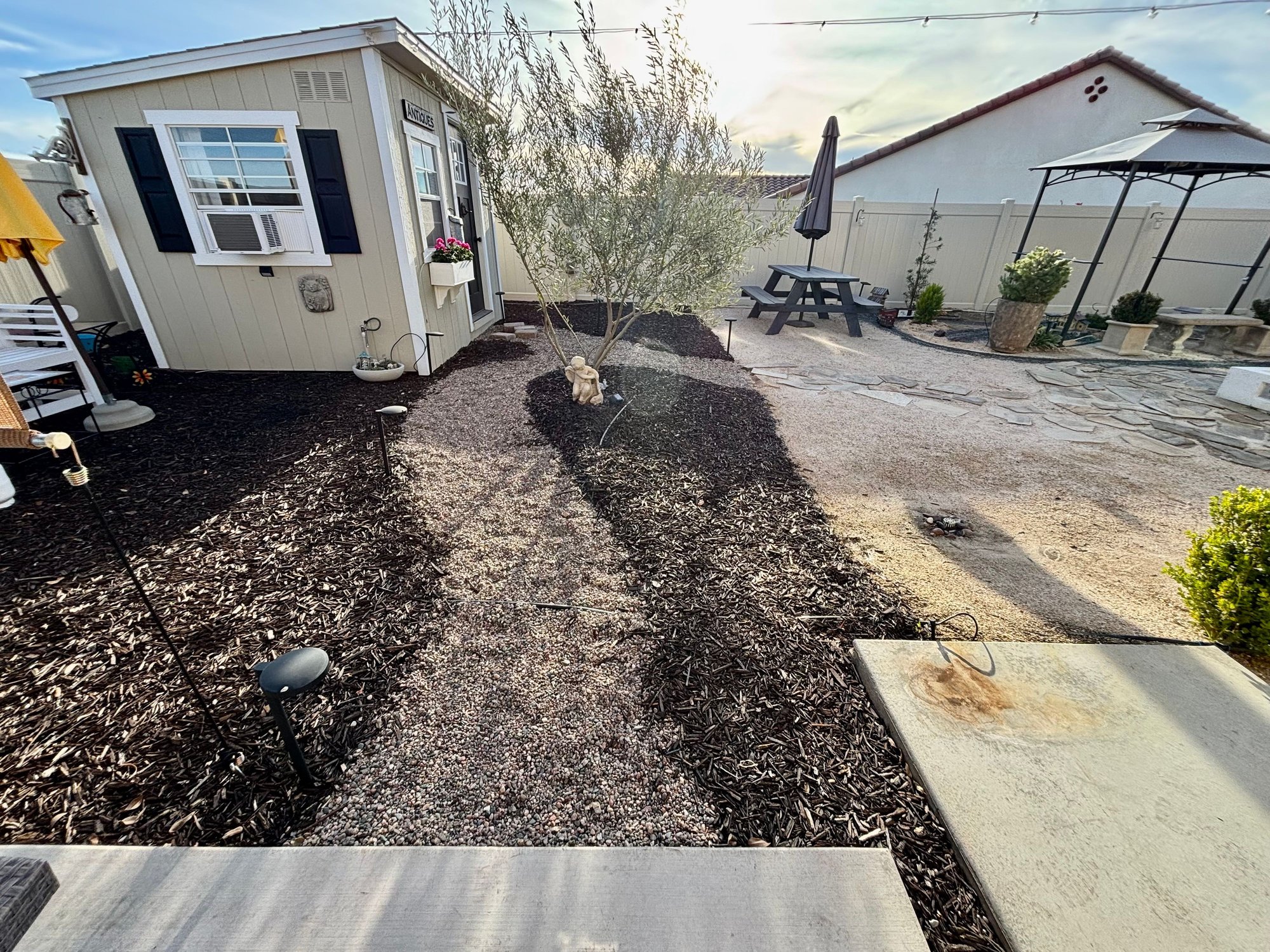 2 years ago I laid a Flagstone walkway thru the middle and made a circle in the center for. Fire Table & chairs.