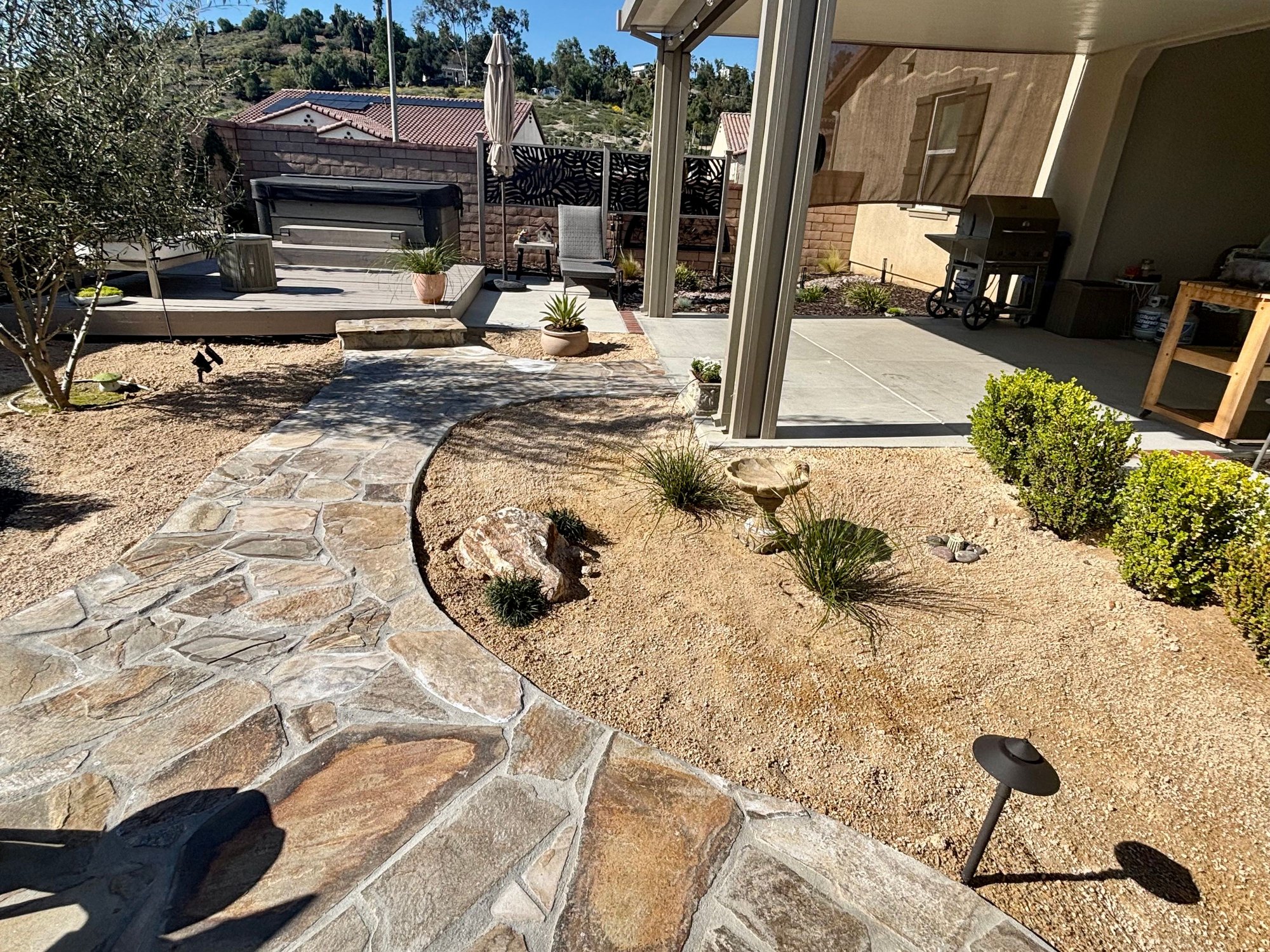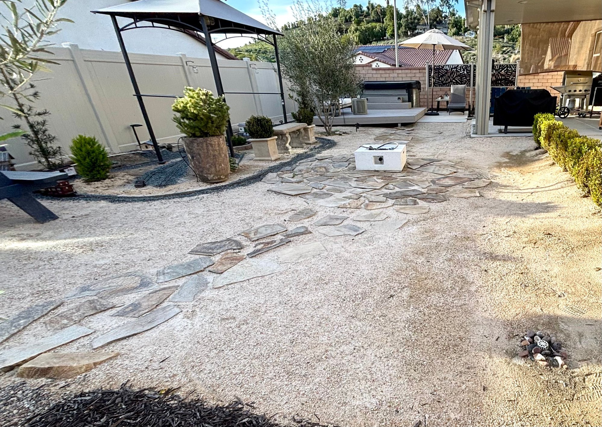 There's still DG along the sides but you can walk on either concrete , Brick or Flagstone barefoot even