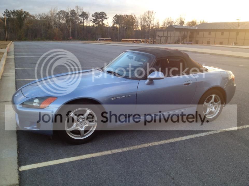 After snooping around and reading the forum for about a year I finally had the chance (and money) to purchase an S2000. I seriously looked for about 3 months and found one that was what I thought to be a good deal. $10,600 for a 2002 Suzuka Blue with 99k. It's not perfect, a few paint blemishes and chips on the front, but mechanically it's perfect. I've had it for 2 days now and checked the fluid levels last night, all's good! So happy to finally have my dream car! My first order of business is going to be to replace the rear tires, cahnge the oil, tranny, and diff fluids, remove the front strut bar, and take off the awful drilled and slotted front rotors and replace them with some better slotted ones. I'll also put some better pads on the front as well.