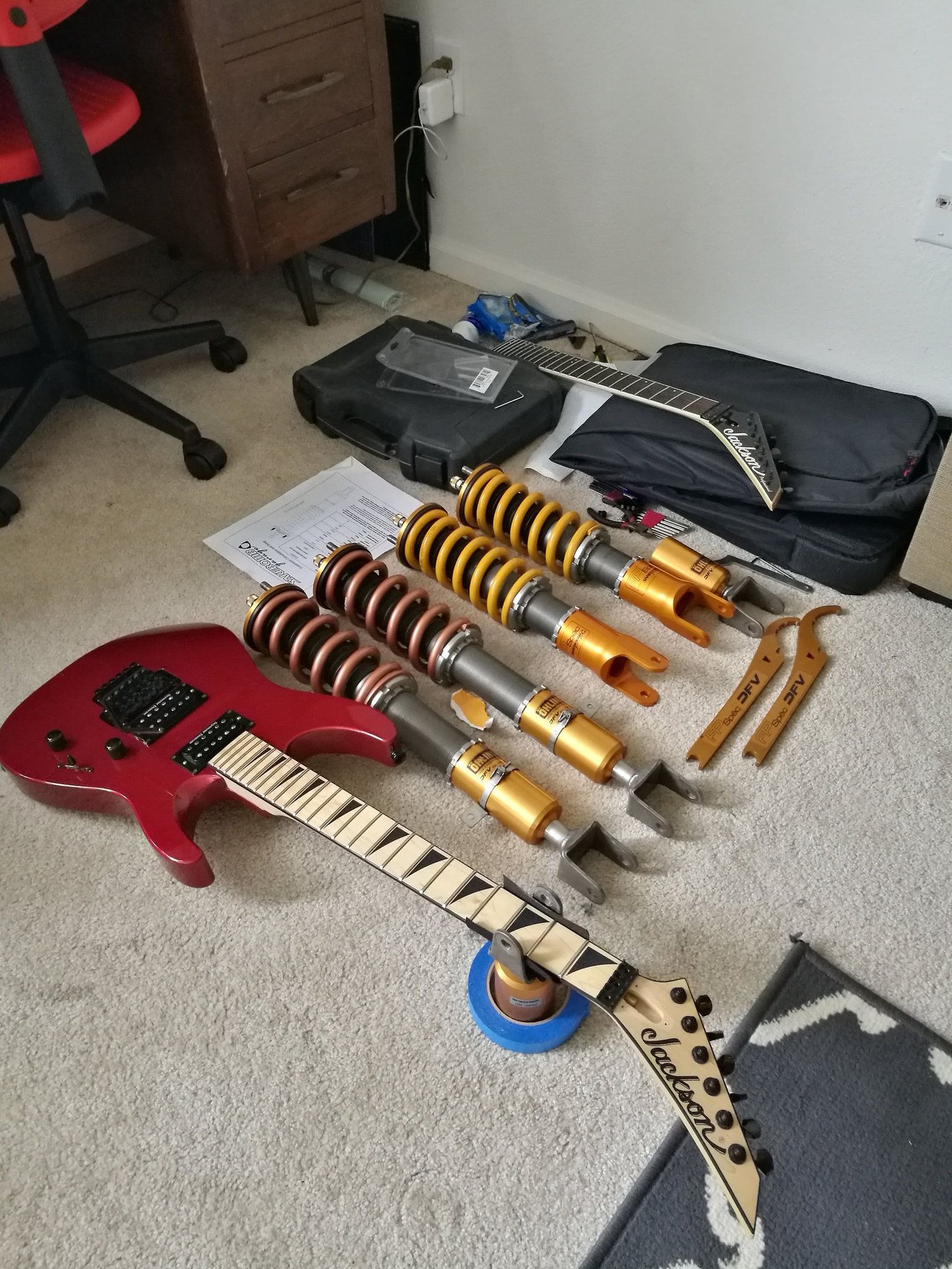 Picked up another Jackson (DK2M) to play while my Fusion project gets wrapped up. Spent yesterday putting my shocks back together and cleaning the guitar up (another neglected pawn shop find). The standard Ohlins DFV lower cups actually make great neck stands for tech work