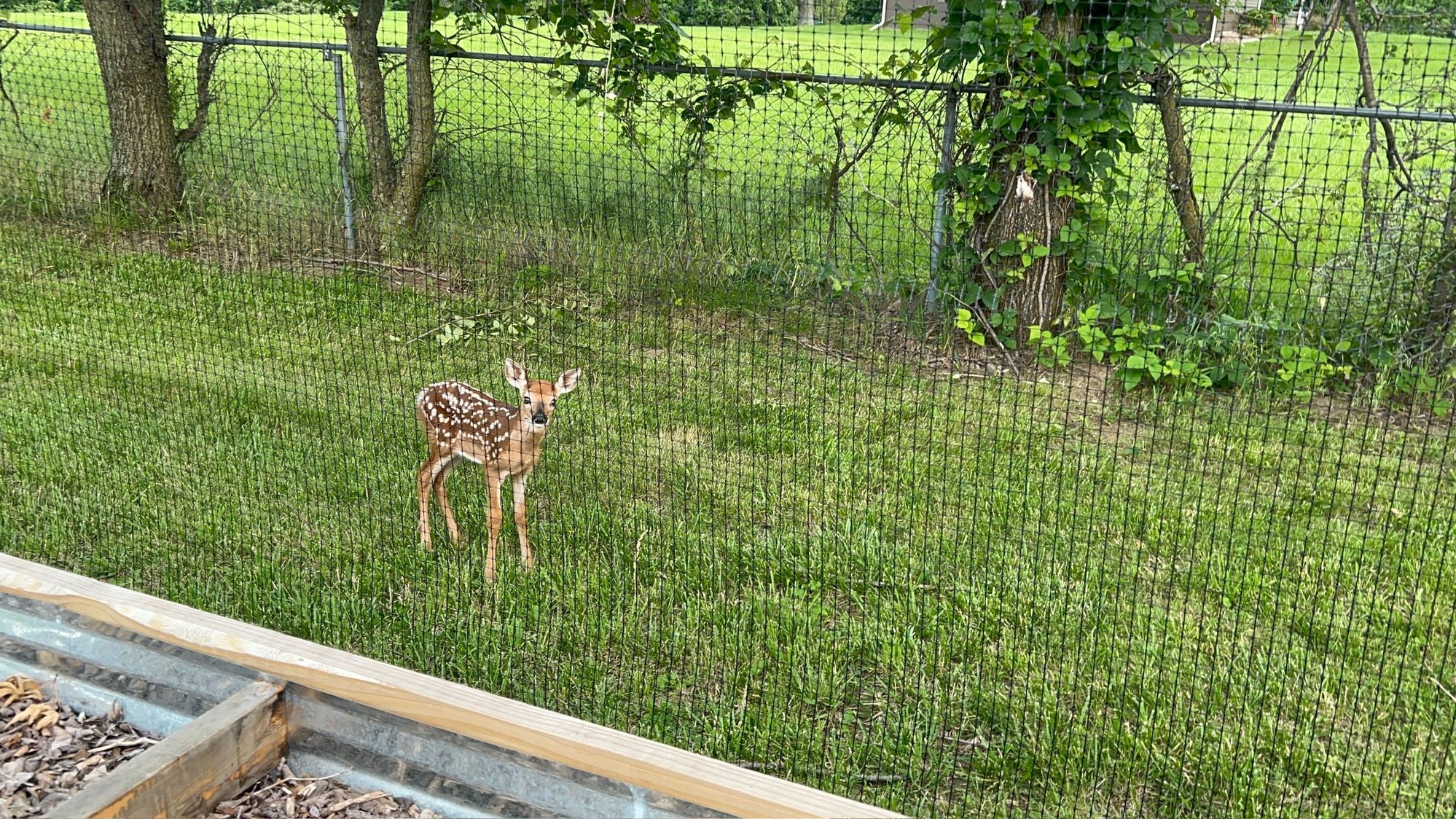 This was from last year. We had 3 fawns living around the yard and this one was super curious of me in the garden. It kept showing up when I was out there and even walked almost up on the porch when we were sitting out there one night. The dog tried to make friends with this one but just pissed it off!