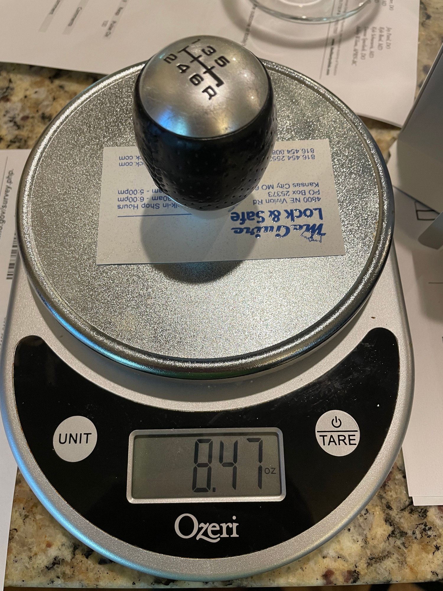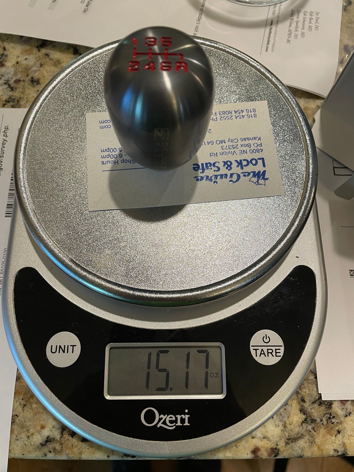 Moddiction about 1 lb, nice and heavy. Took about an inch or so from the original knob