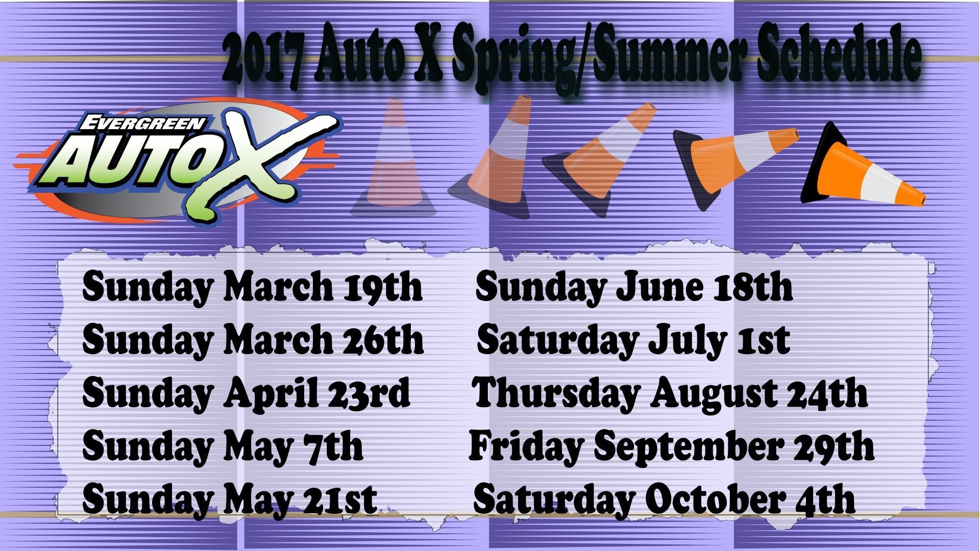 Here is the current Evergreen AutoX schedule for the Spring/Summer. There is an event Sunday, but it's already sold out but if you want to see how the layout is or how it works, spectators are free in the grandstand