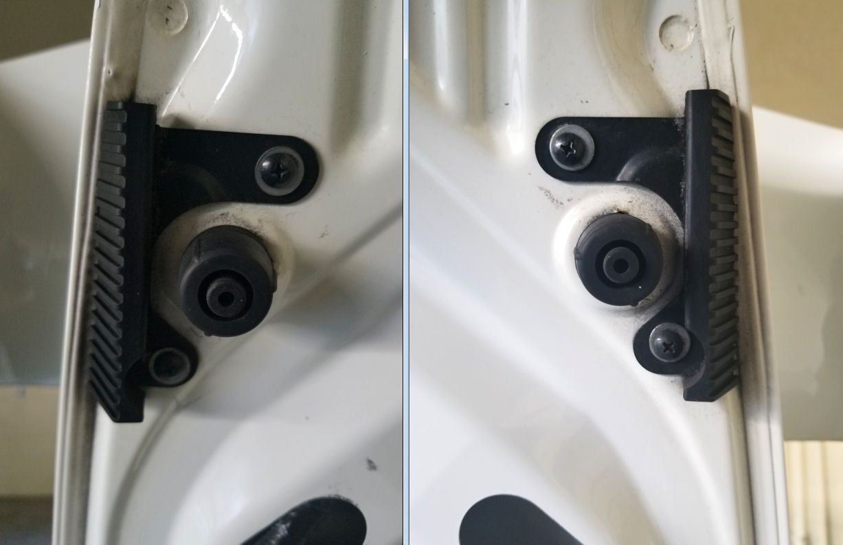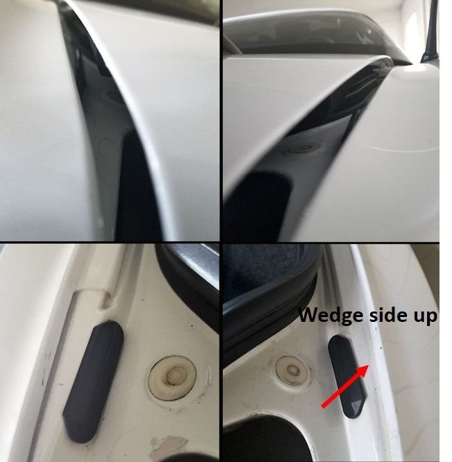 The upper side trunk stoppers, left and right, (74442-S2A-A00 Stopper, R. Trunk Side and 74492-S2A-A00 Stopper, L. Trunk Side) can be adjusted in and out. Properly adjusted and when the trunk is closed, you should be able to slide a piece of paper between the upper side trunk stoppers and the lower side trunk protectors 74443-S2A-A00 Protector, Trunk Side. Over time, the upper side trunk stoppers, as a result of the flexing of the trunk, at speed, will imprint/score the teeth into the lower protectors. If you look at trunk pictures of the 08-09 CRs you can see these marks. It could be that the braces created in yours and other DYI projects are stronger than the factory trunk's and this is not happening. I pointed this out because when you order the OEM part 74443-S2A-A00 Protector, Trunk Side (2) they don't look anything like what you might expect and then the challenge is to figure out which side of the lower side trunk protectors goes up. I can confirm, after researching this topic, that the wedge side is mounted up.