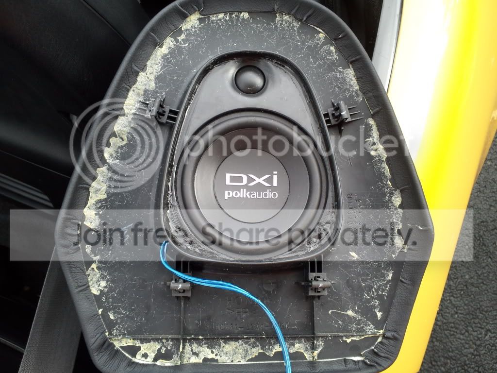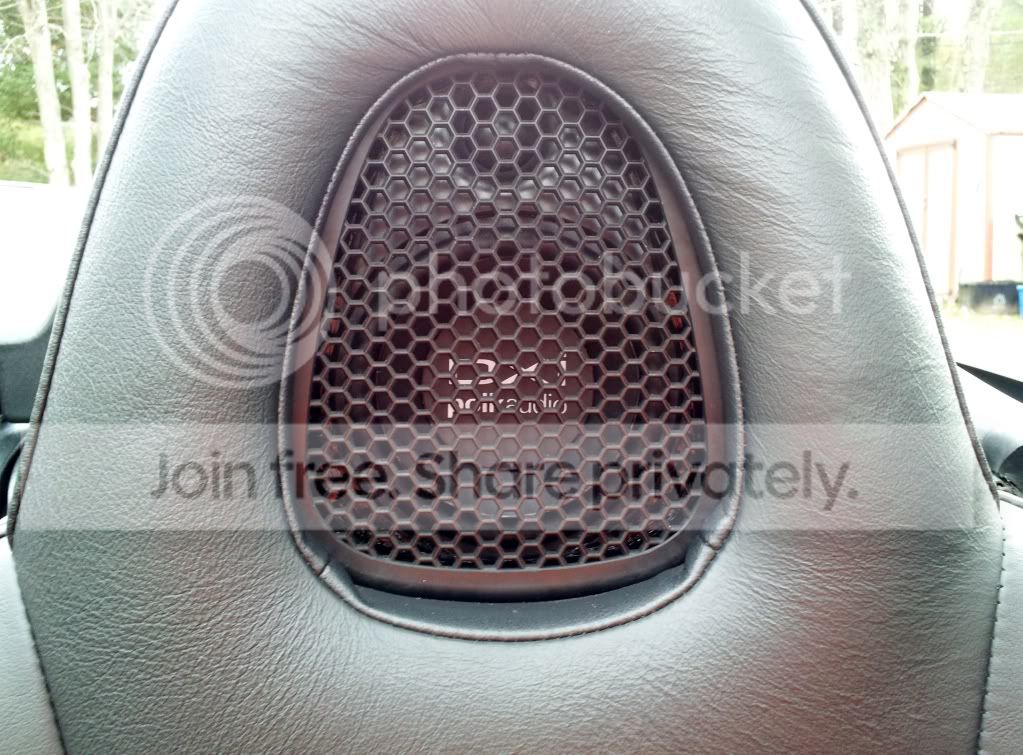 I have wanted to put a second set of speakers in the vehicle. After hours of searching the forums and car stereo stores I came up with this idea and thought I would share with everyone. First I found a set of 4x6 Polk audio speakers at Best Buy. I then took the rear plastic covers off of the back of the seats. I then traced the outline of the cover on the speaker and then trimmed the speaker down with a dremel to make it fit inside the mesh hole. Once it was down to size I then took a piece of 1/4 flat foam and layered it down in front of the speaker and placed the cover over the foam. This was to give the speaker coil room to move without touching the mesh. I then placed the speaker inside the cover and used epoxy to glue the speaker to the cover. I then drilled a hole in the side of the cover to allow for the speaker wire to connect to speaker. I then went over to the local auto interior store and had them put foam over the back of the cover. They sanded down the foam to mold it to the contour of the cover and speaker and covered with leather.