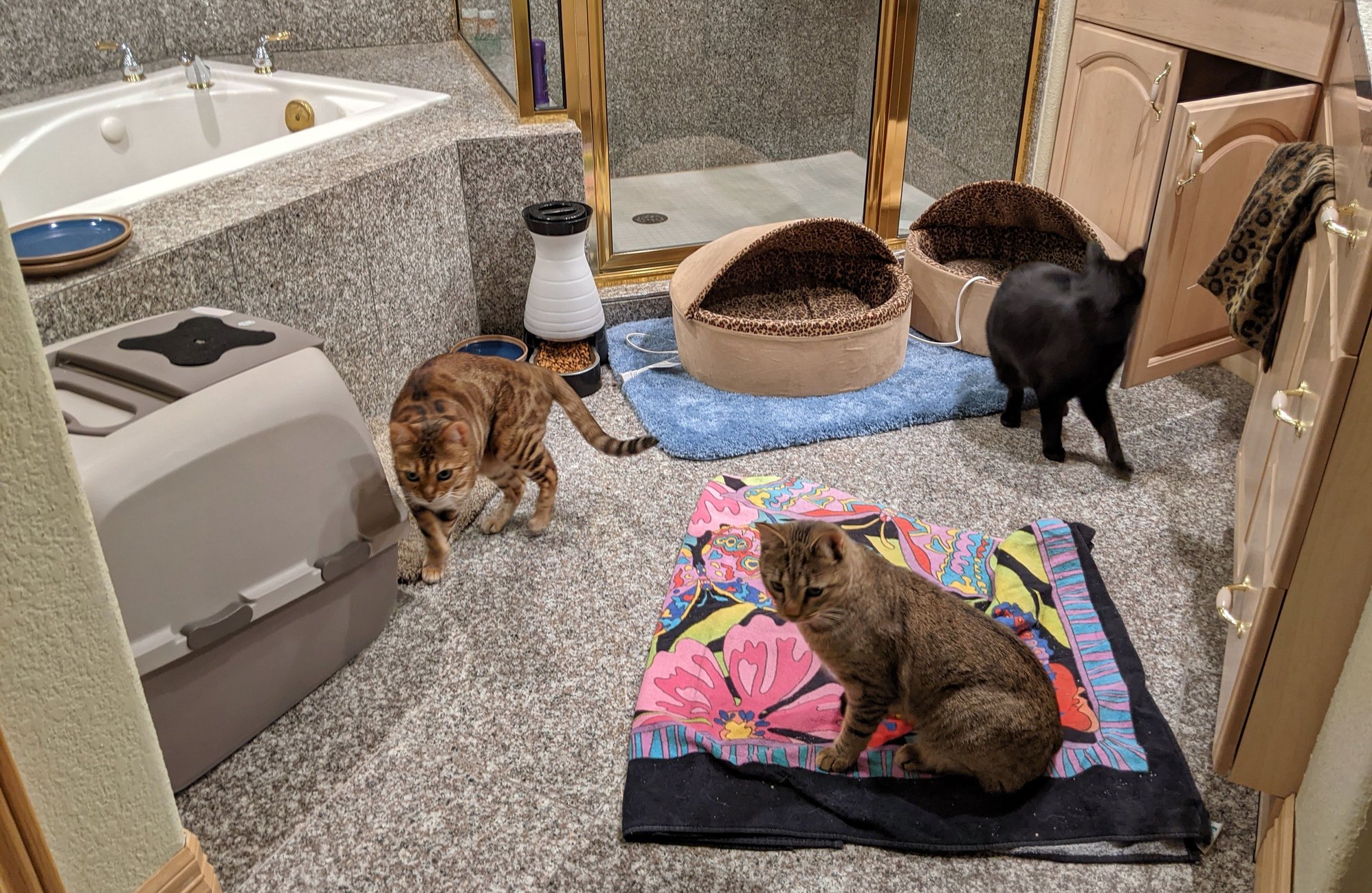 I hadn't planned on spending my weekend in a bathroom with three cats but I'm so glad I can! I arrived at my son's house just after midnight on Saturday morning. We're waiting out the fire here. I know it's getting scary right now at the house because they just made another mandatory evacuation about four miles north of my house. The fire's coming from the west and the north but I still have confidence that my house won't burn. My next door neighbors did not evacuate and the last time I talked to him he said it's really gotten windy as predicted.