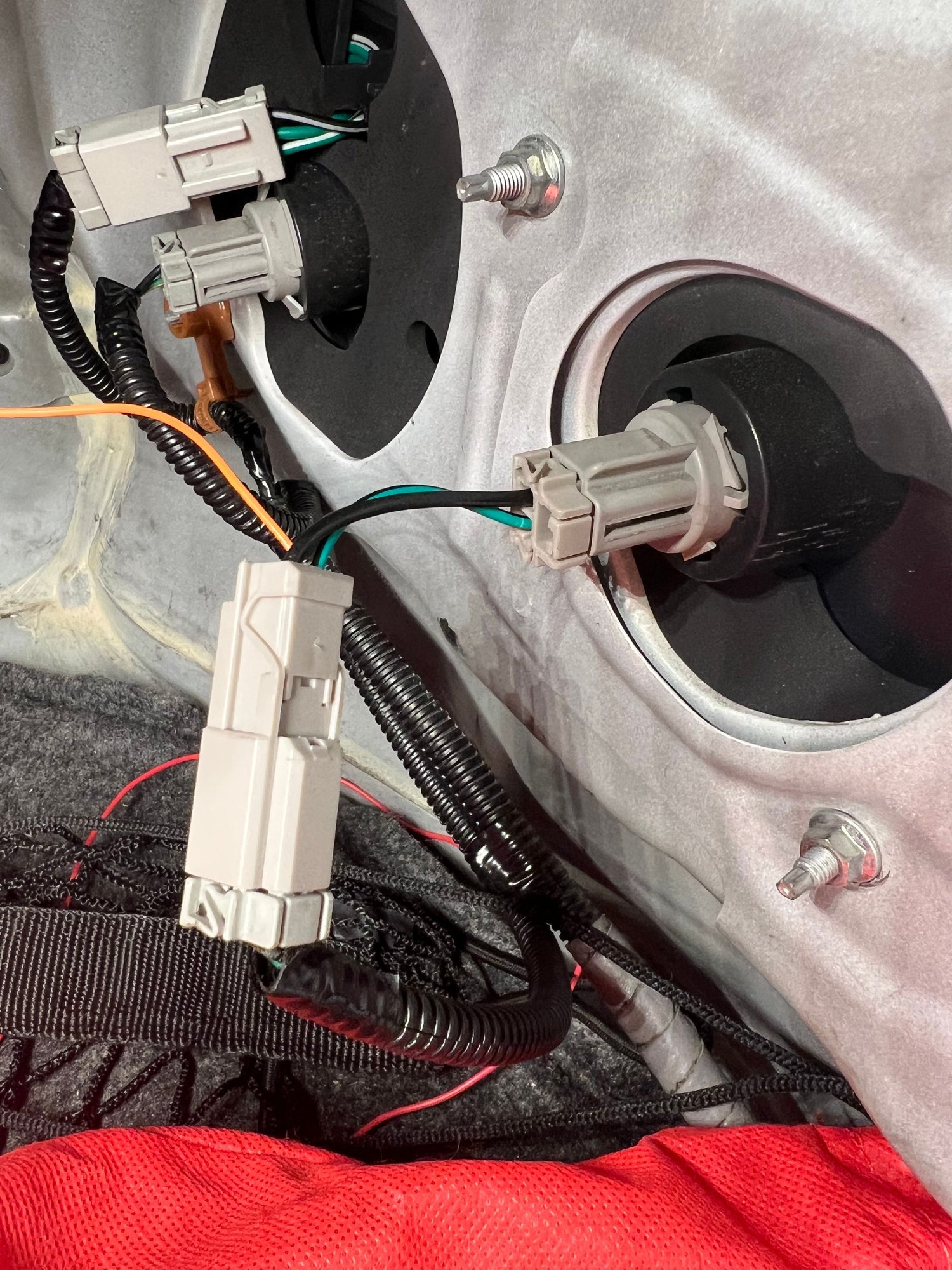 I am including a picture of a harness that is not covered in wire loom that is wired in the exact same way as the one that's shown covered in wire loom within my trunk area. It's a simple harness to make. Please be aware that the best way to crimp wires to the open barrel terminal pins used by the Sumitomo connectors requires using a suitable crimping tool.