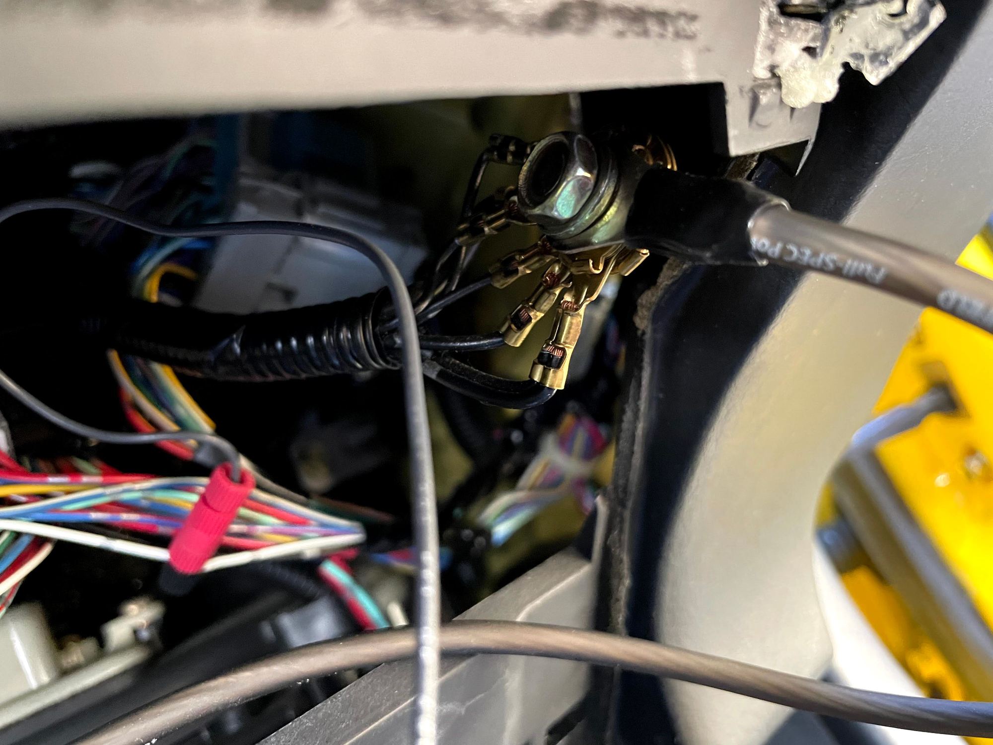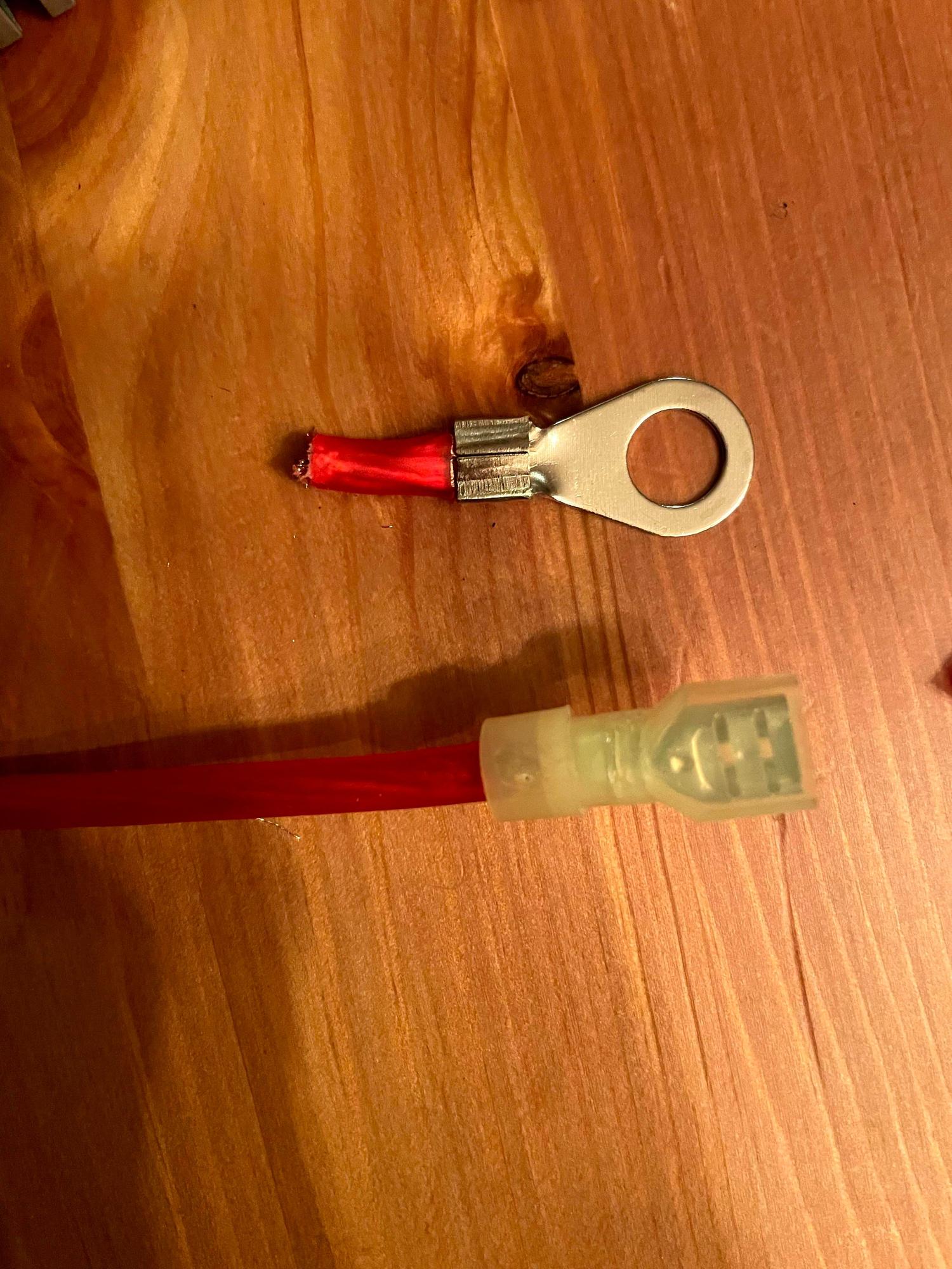 Here, we cut off the end of the wire with the ring terminal and crimp a spade connector on.