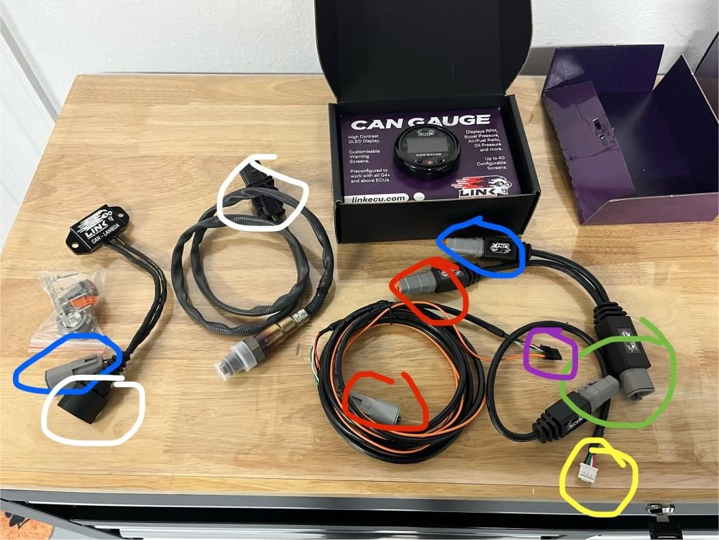 reds connect, blues connect, greens connect, yellow goes to ecu, purple goes to gauge. I didn’t know where to buy a harness extension as LINK doesn’t sell one. I was just recently sent a link for the extension I need so I will be buying that and installing this.