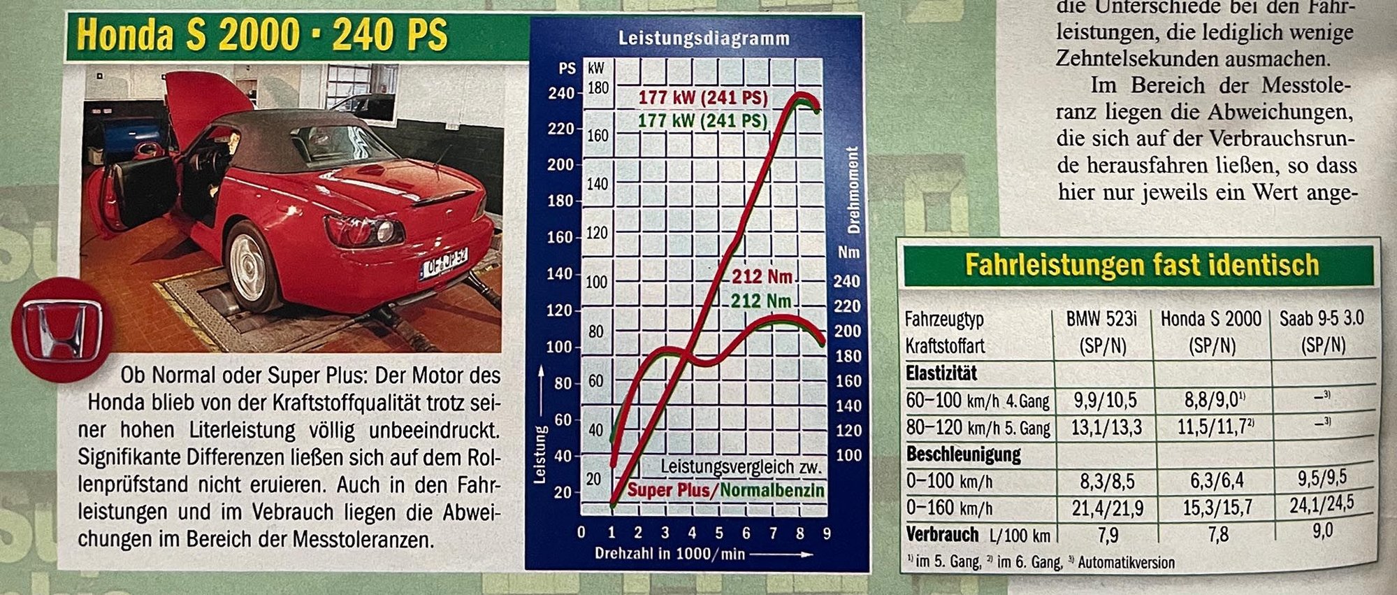 If Memory serves me, they used a S2000 on a Dyno to see wich difference the - back then - 3 different fuels we had make. We had regular 91 ROZ, Super 95 ROZ and Super Plus 98 ROZ available back then.