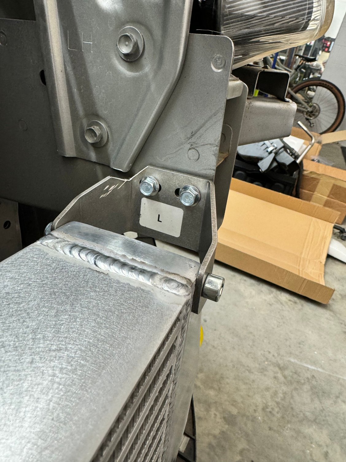 I had to modify the intercooler brackets a bit with my grinder to make sure they cleared the frame. I wanted to be sure the intercooler didn’t hit the bumper so I mounted the brackets all the way back.