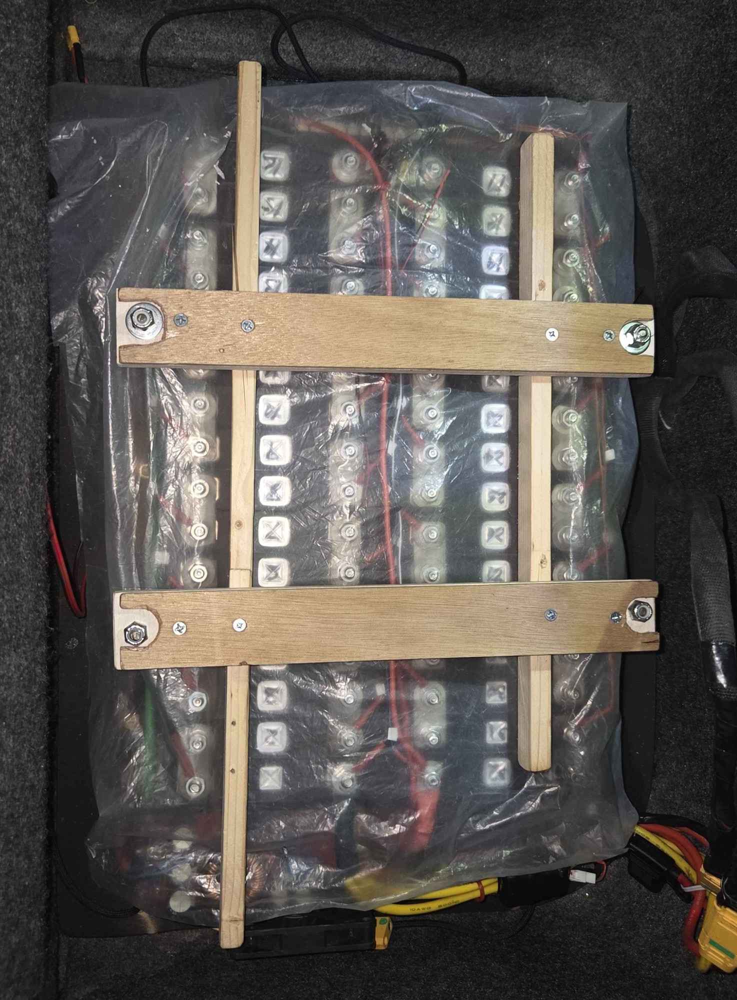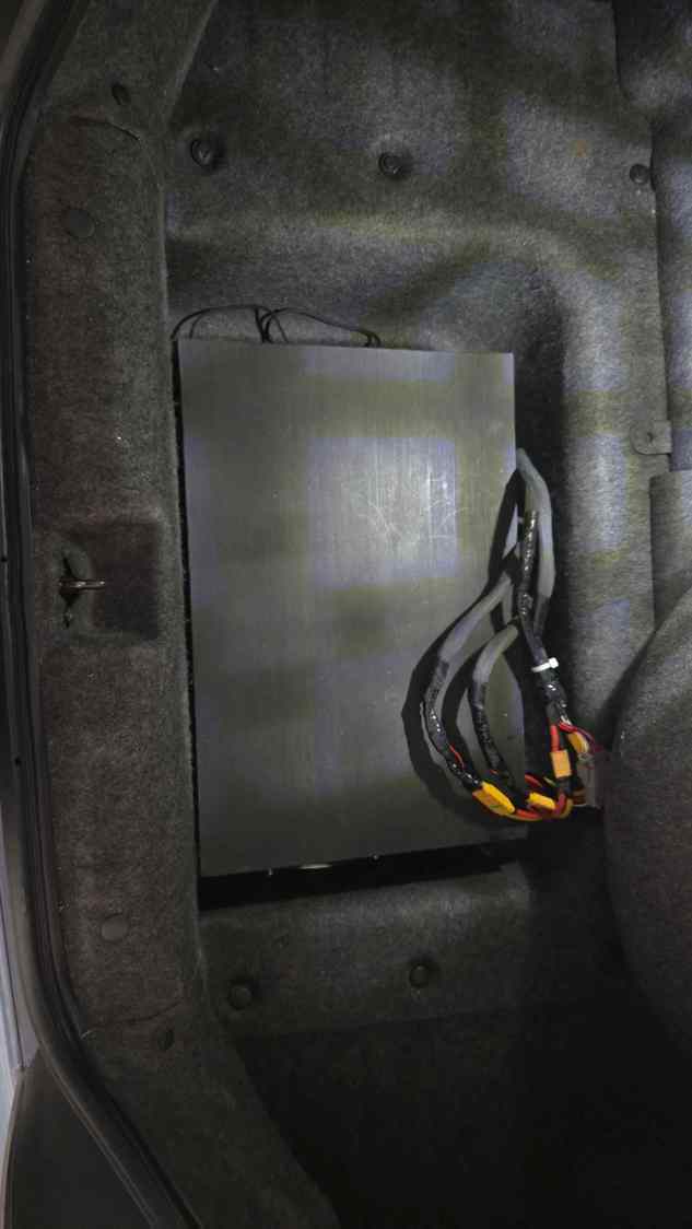 The battery has a voltage of 84V and consists of 32 LTO cells in series. There is a charge only BMS and a 12V to 84V upconverter to continuously charge them from the alternator. The cells I am using are no-name (Generic) LTO prismatic cells. I could not find these cells any other way. There are brand name cells similar to these at 2.9 ahr and 10 ahr, but these fit in the trunk nicely and seem adequate. They are rated at 6 ahr with a C rating of 80, which means they can output 480 Amps. I need about 200 amps to get to 6 psi of boost at 8k rpm. These cells handle 200 amps easily - no heat, almost no voltage drop. They are durable and hard to kill, plus LTO is very safe. The only downside I can see is their weight - about 30 pounds for the complete battery and charger. At some point I may save some weight and replace this battery with the 2.9 Ahr cells. I expect the current battery has more capacity than I will use, the way I drive the car (street only). I figure this battery has about the same capacity as a 10lb bottle of nitrous, ie 100 hp for 100s, or 50 hp for 200 s. But of course it recharges itself when you drive, or it can be charged at home if needed.