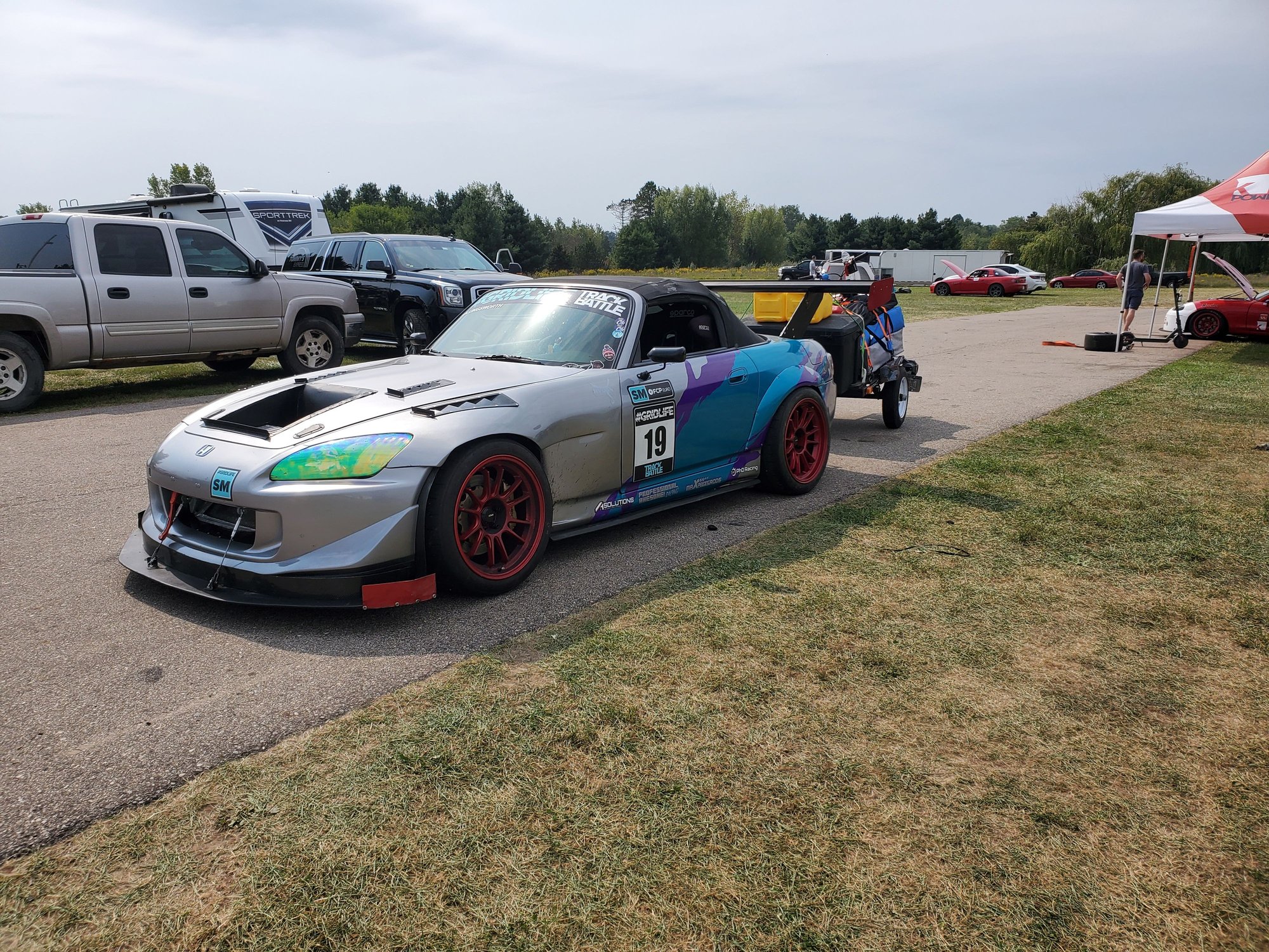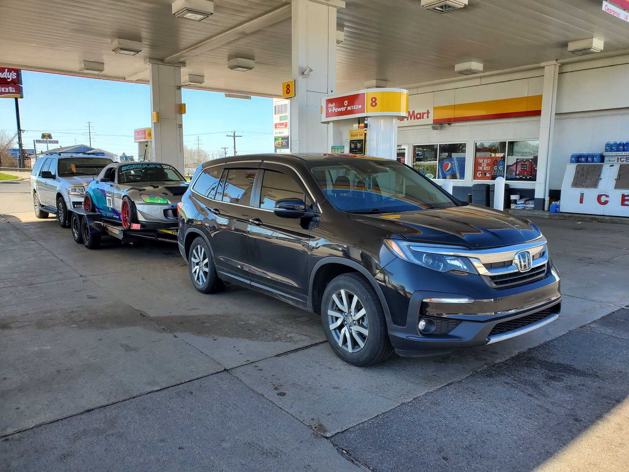 then onto likely the biggest game changer for this season is trading in my 2016 civic for a 2019 pilot and them picking up a small-ish beat to shit car hauler. thing tows great, i average between 19-21mpg towing depending on how fast i drive. pretty stoked for this and alleviated alot of the stress of having to remind myself that i gotta drive this puppy home after the event