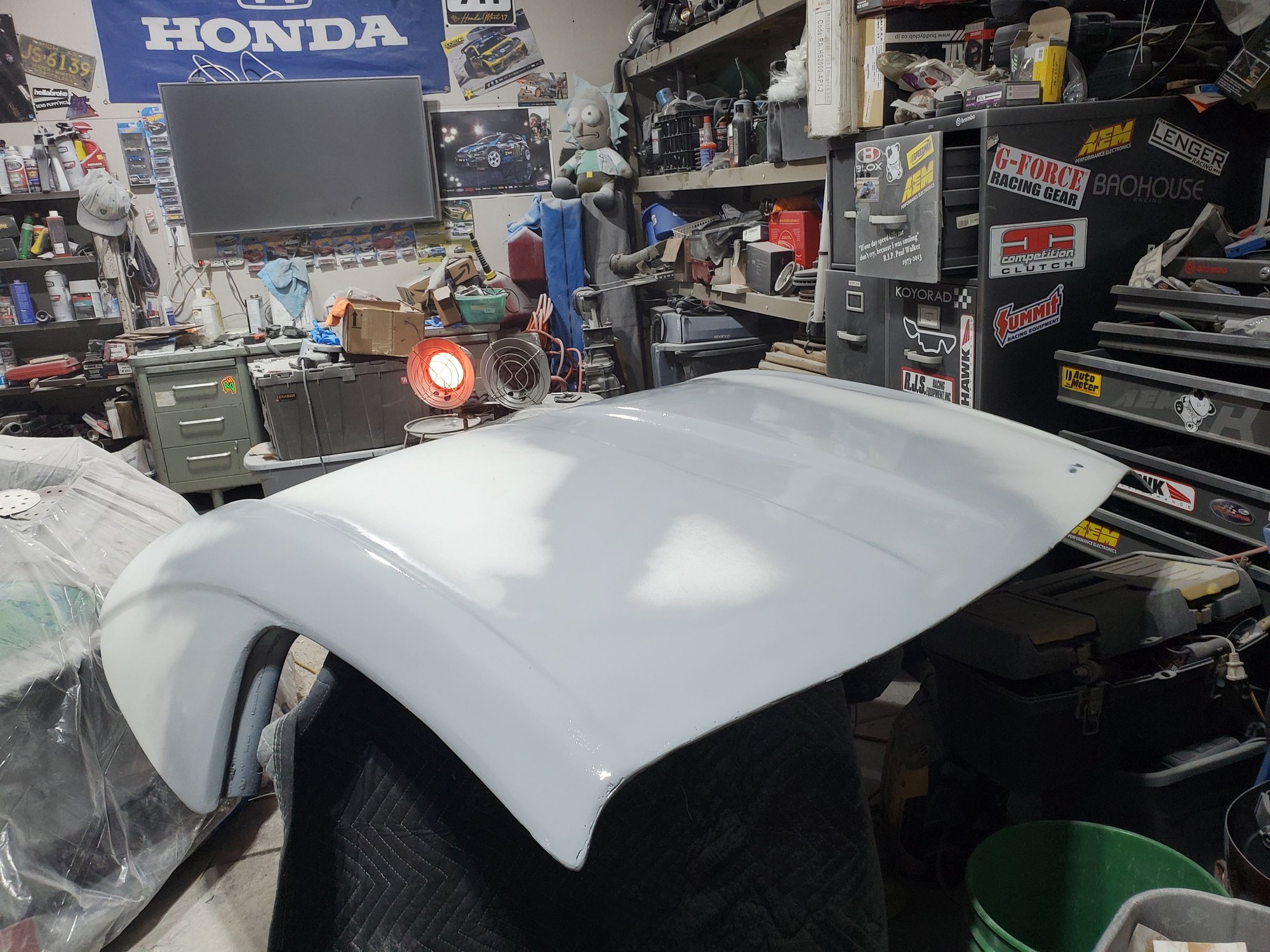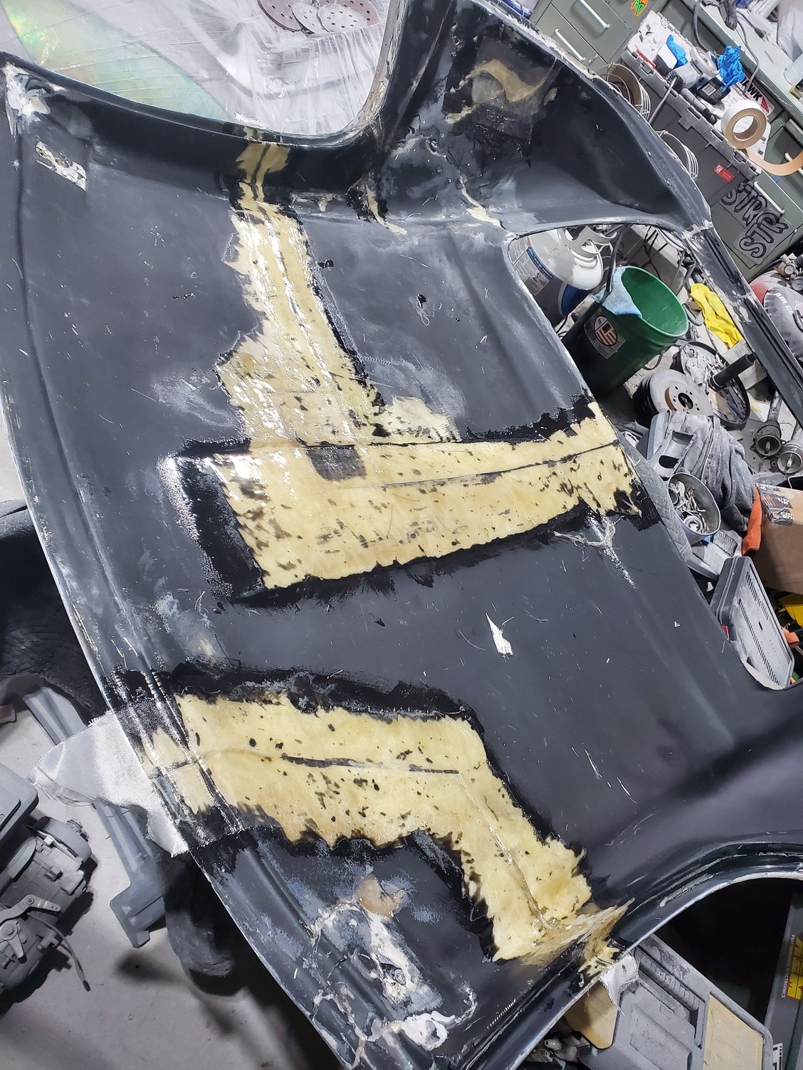 i have literally hundreds of pictures of this process, this was no small feat and took probably close to 50+ hours of work....sooo much sanding and blocking. i used panel bond to bond the inner and outer back together. now this part happened later i will put it here just for continuity sake to finish off the hardtop saga. walking through home depot i spotted this out the corner of my eye, so i grabbed it figuring there is no way. test panel said more than close enough for a racecar, do i recommend on your street car ... no, for a race car plenty good enough. wasnt sure if i wanted to flow the llivery but super glad i did i think it looks great. oh and i just blasted it with the same brand rattle can clear coat as well.