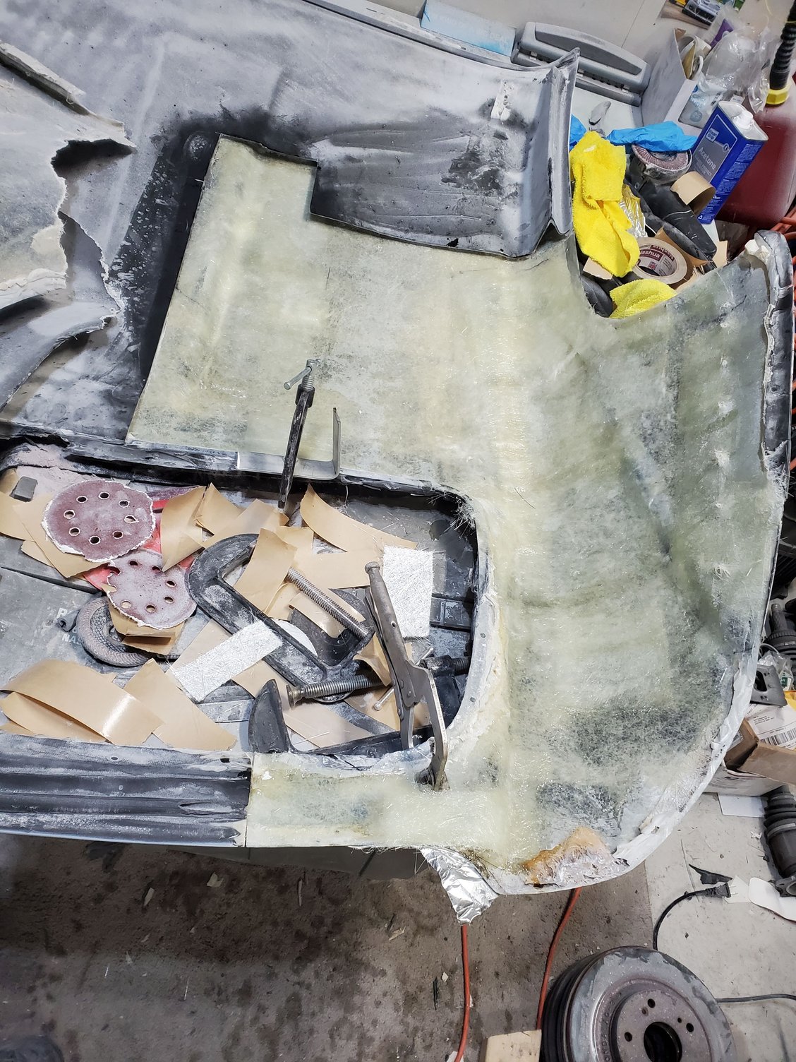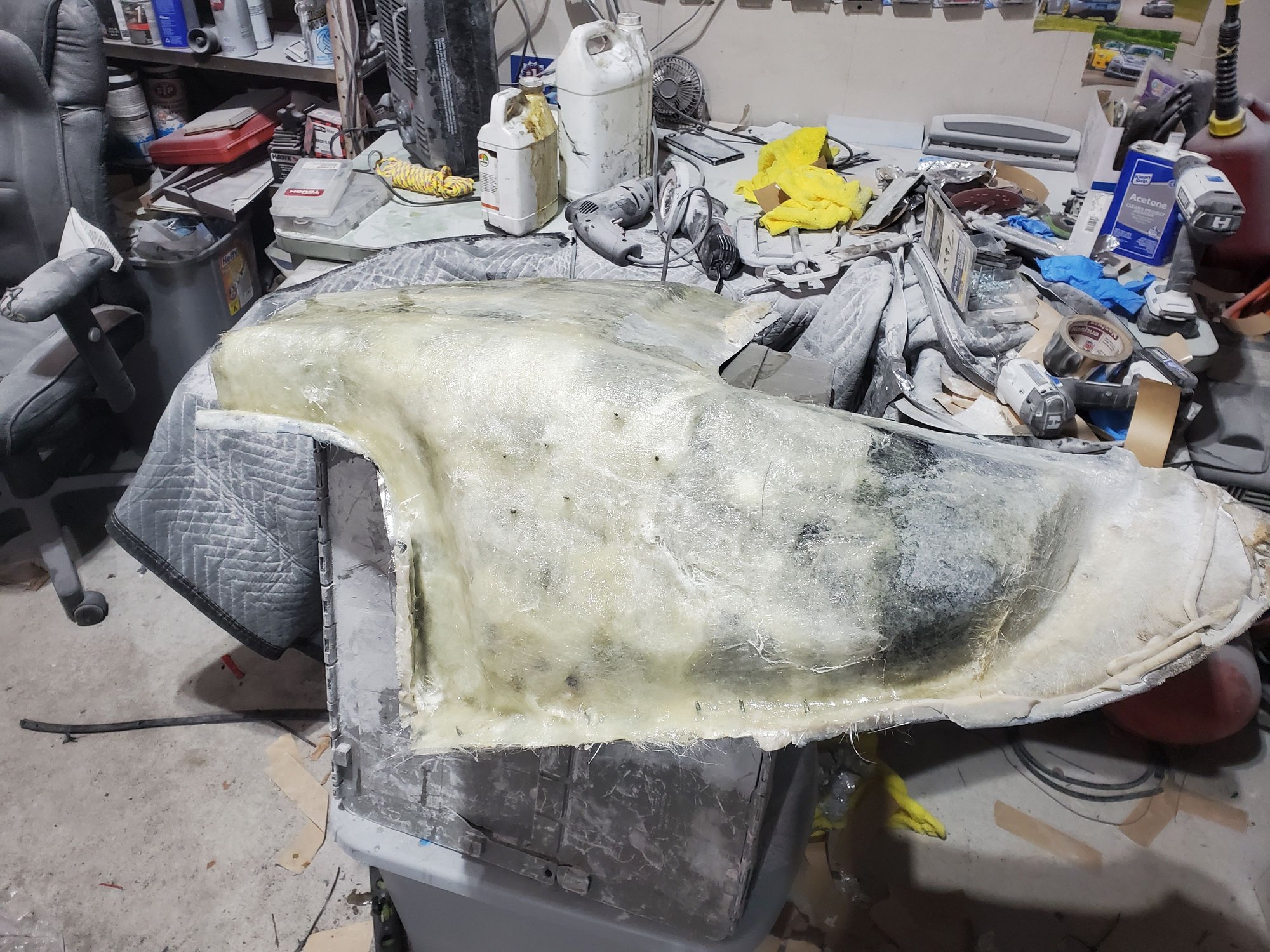 so i got to work, first step was cutting the hardtops inner and outer shell apart to fix the damage from the backside. this allows me to grind out all the cracks and damaged fiberglass and then layup arguably too much fiberglass to repair it. i figured better safe than sorry id rather have a top a couple pounds too heavy that will never fail than try t be a weight weenie and have issues later on.