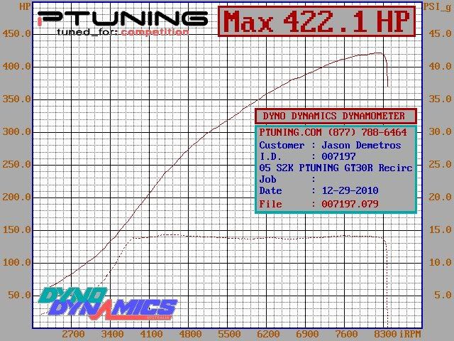 I'm using their GT3076R turbo kit with PTuning dual exhaust and PTuning Setrab oil cooler (for track duty). The car is tuned on Kpro to 422whp, 304 wheel ft/lb on 14psi. See dyno graph below. The car is used for road trips, casual drives, and HPDE. During it's initial run on the track it held oil temperatures to a max of 230* and coolant hit a max of 190* in ~50* ambient temps. As you can see from the dyno graph power is very linear and can be easily modulated on track via your right foot. This is not an on/off turbo kit.