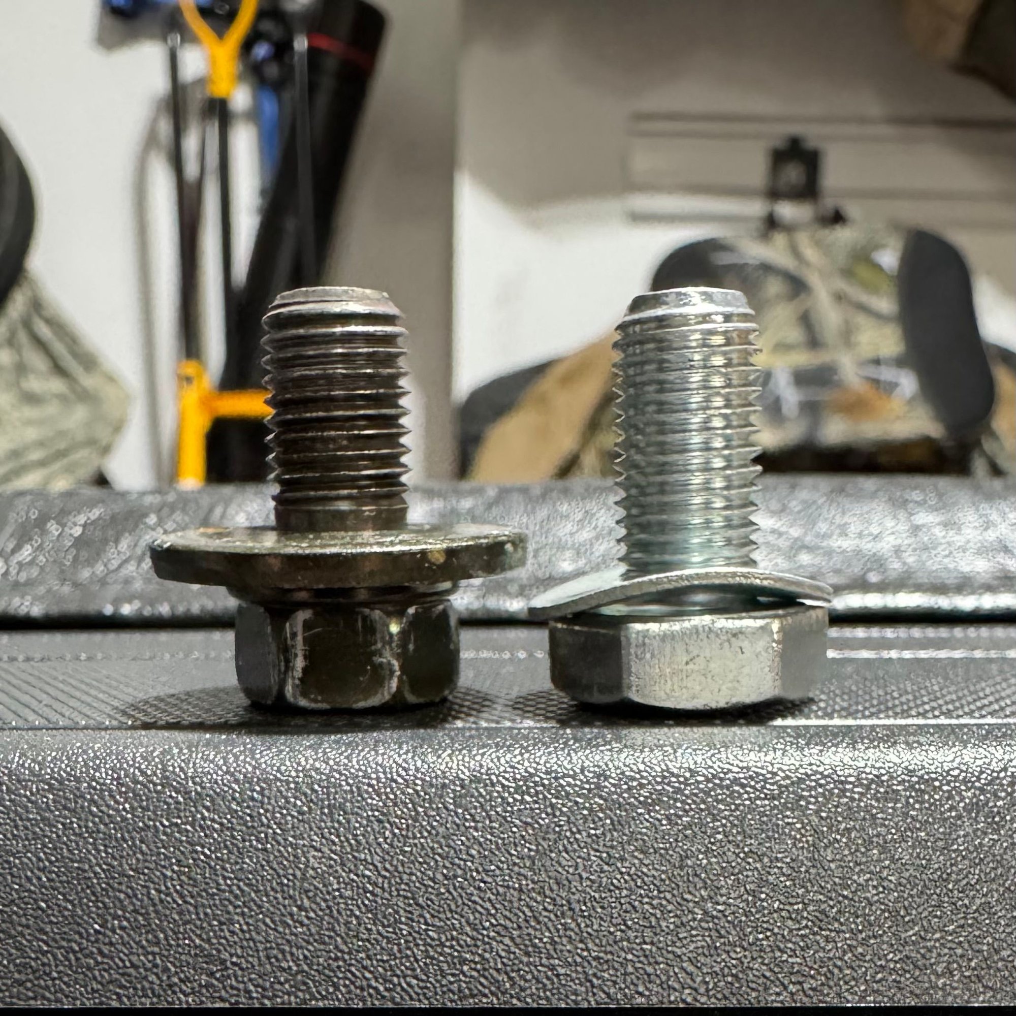 Photo attached for reference. Stock bolt on the left. New bolt & spring washer on the right.