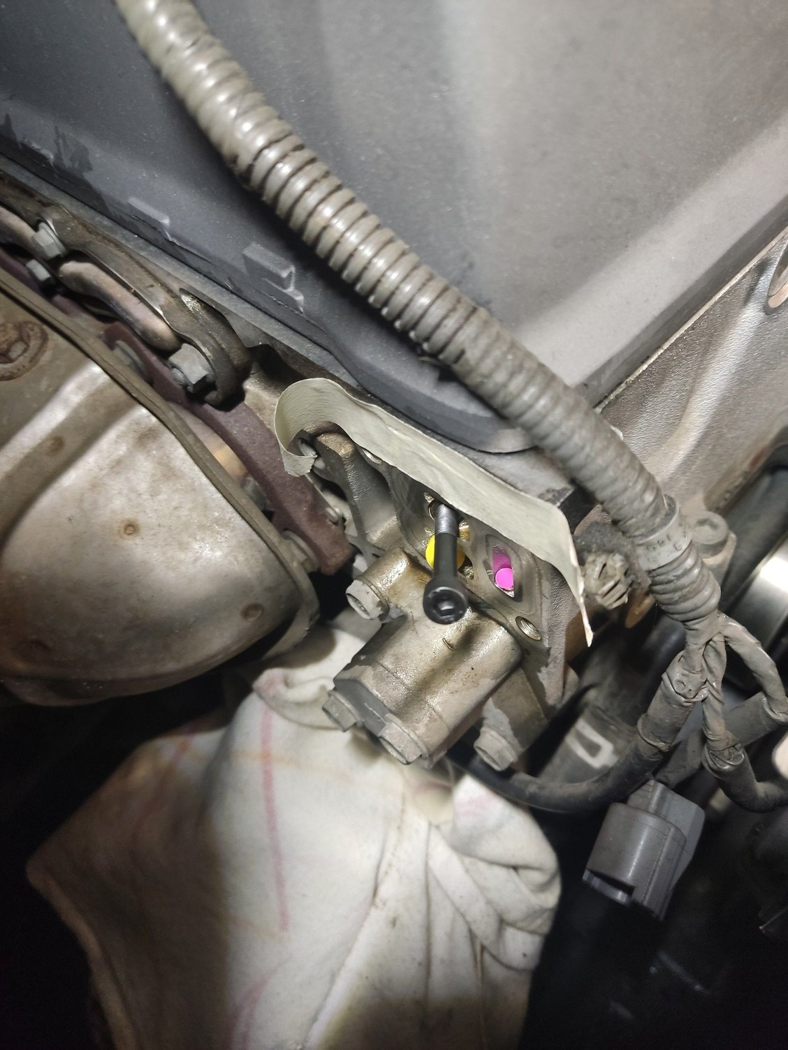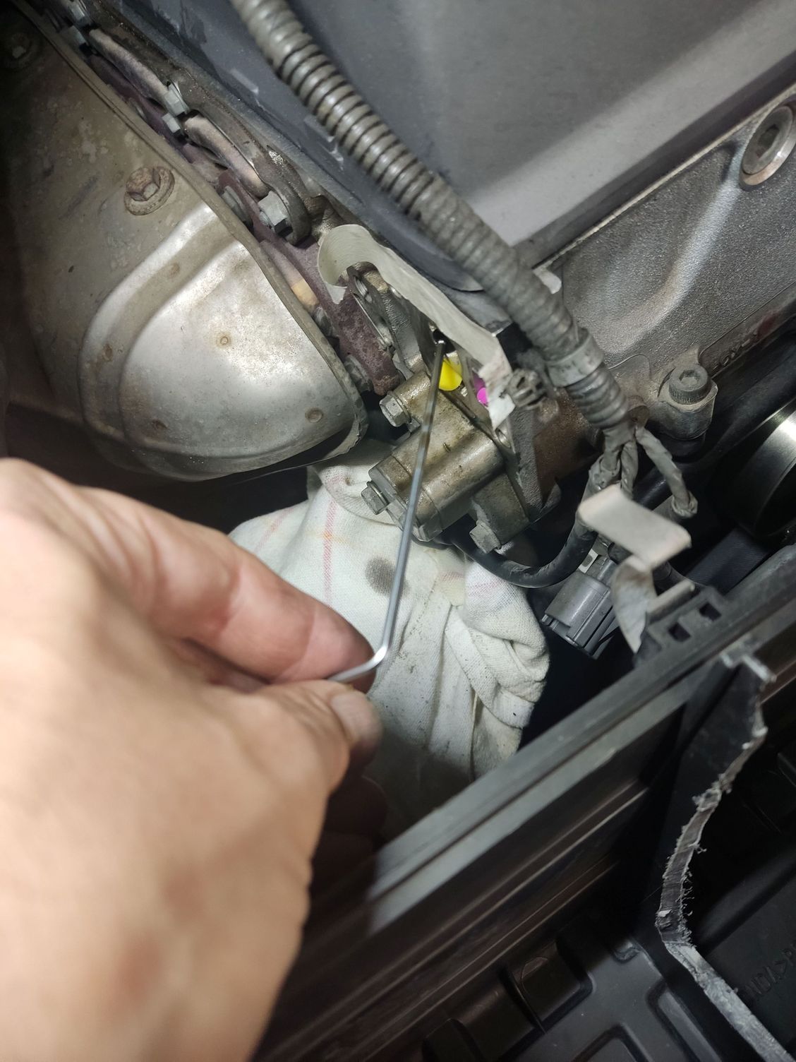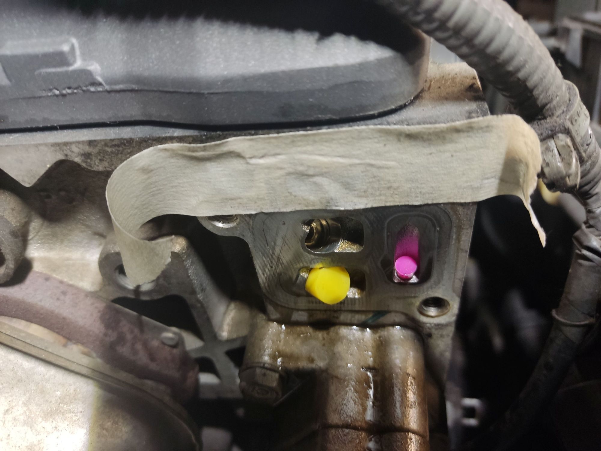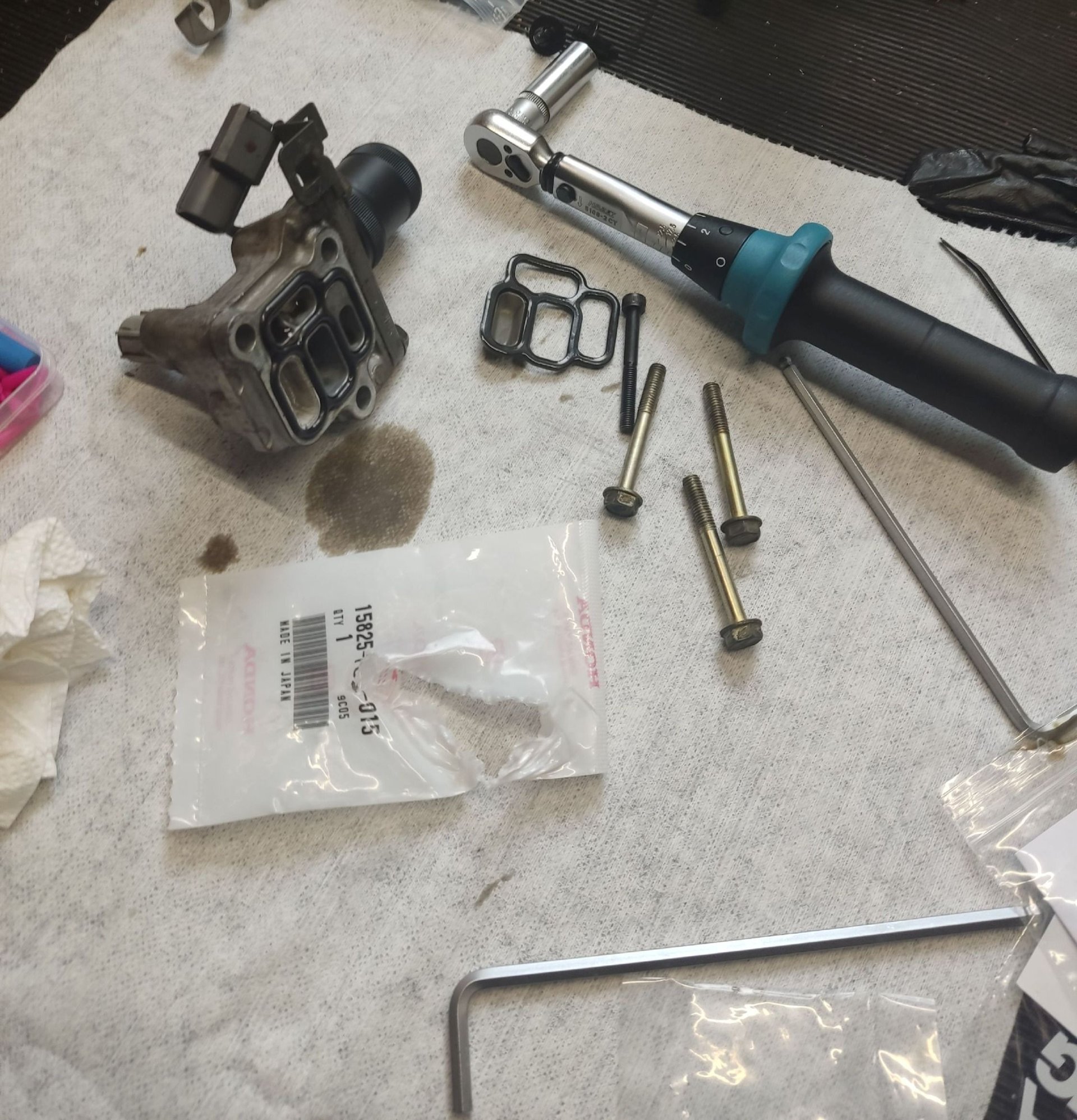 Place a rag over the water hoses of the Oil cooler to catch oil drips, water hoses dont like engine oil. Use a new VTC valve gasket.