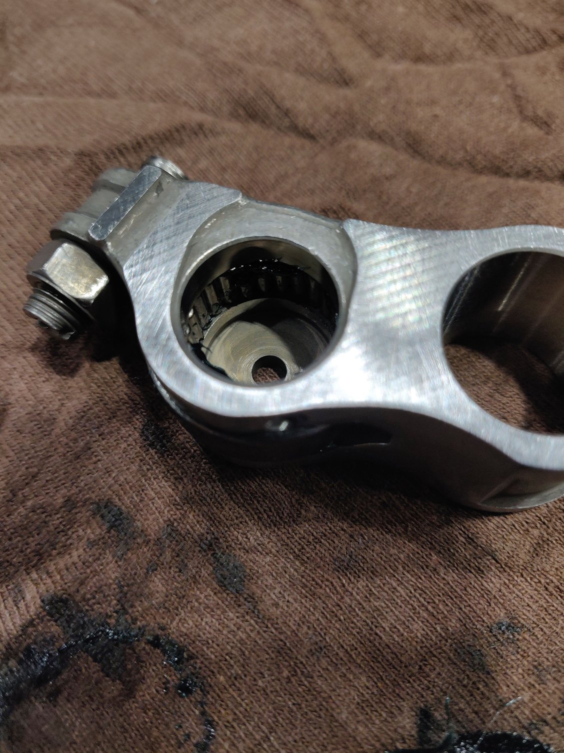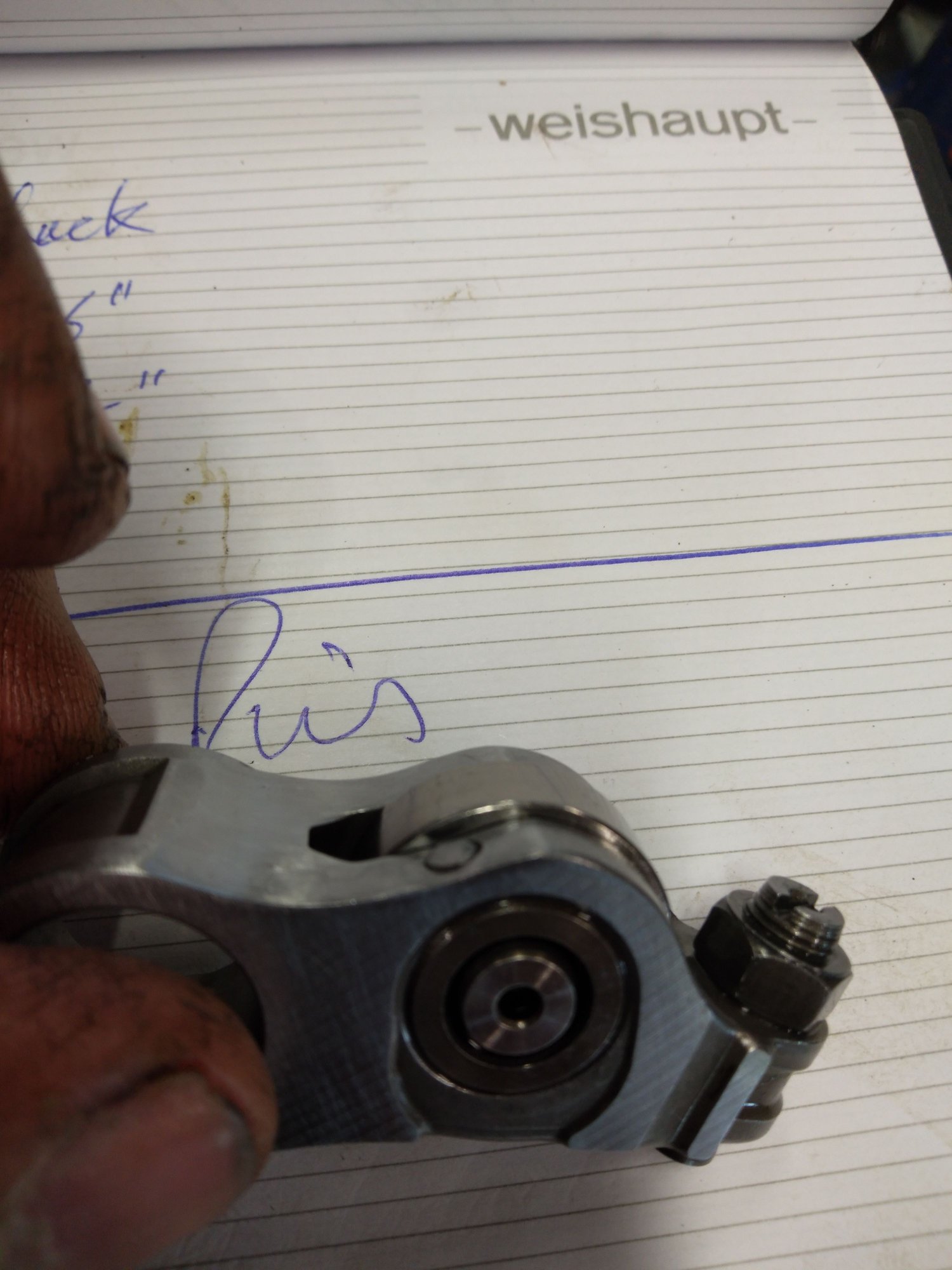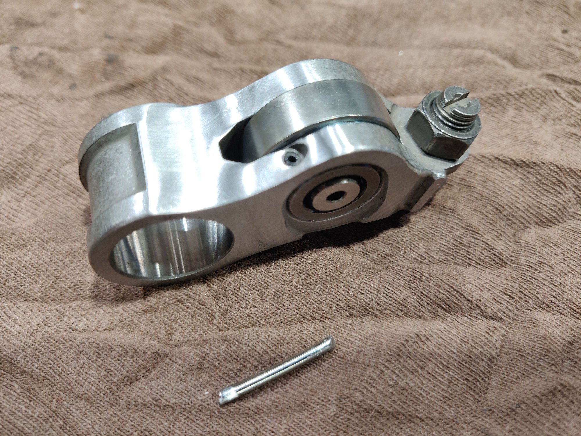 Came up with a mounting solution to fit the rollers one at a time to the Malling machine. Milled the cut out shape through the mount, this also gives you an idea of how it was bolted down. Here is the first one done and after polishing, hard to tell from the picture but it is polished. Because I had to take the rollers out to do the job had to fit the rollers back in one at a time one some grease to hold them in for re assembly All the roller bearings back in. Roller back into the rocker This is the pin that was knocked out of the ones that needed to be machined. It's the pressed retaining pin that holds the roller assembly in place. Here is the machined assembly back together with temporary roll pins holding them together, I did this for test fitting and to make sure all the math (guess work) was correct and there is no contact with the cams. Side profile. Because roll pins would not hold with engine vibrations I had to get some 2mm OD silver steel / ground finished rod to replace what was there as per OEM. This was a bit of a pain in the butt to do, this would have been easy in the assembly plant as I'm sure they would have just had a simple hydraulic setup squeezing the pin from not ends. Had to drill a bit of steel to match the shape of one end of the pin get it into place in the rocker then form the other end with a hammer and punch. Picture after forming the end with hammer and punch it's not coming out of there any time soon.