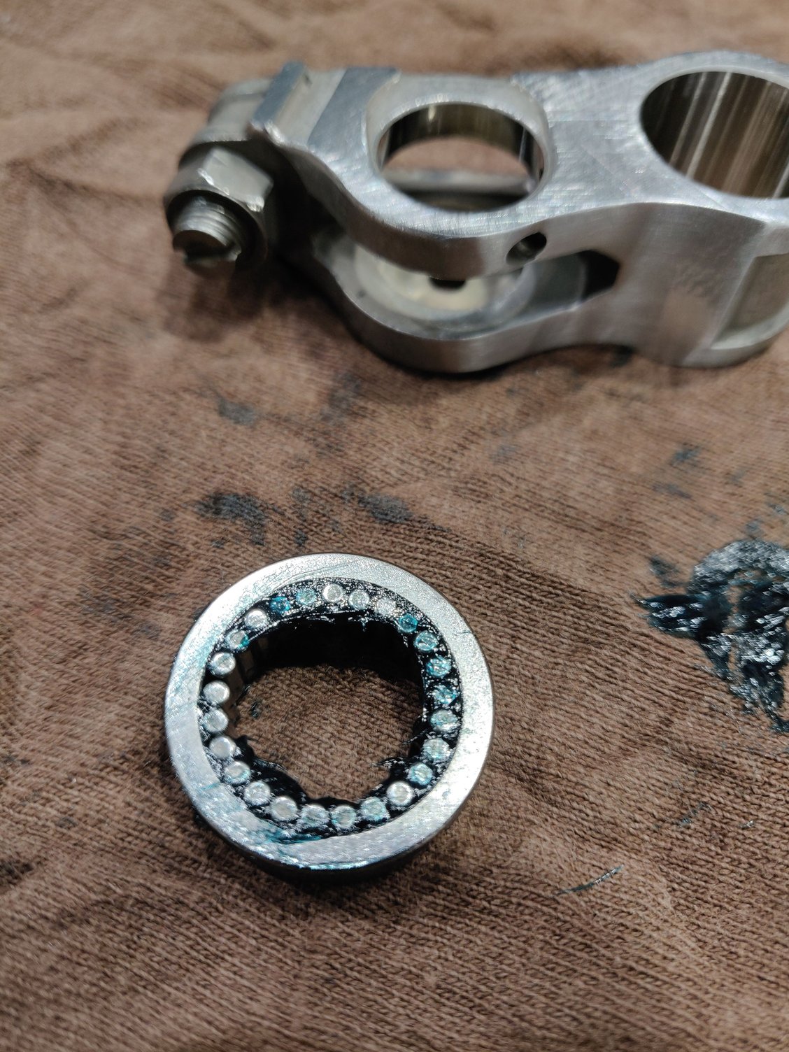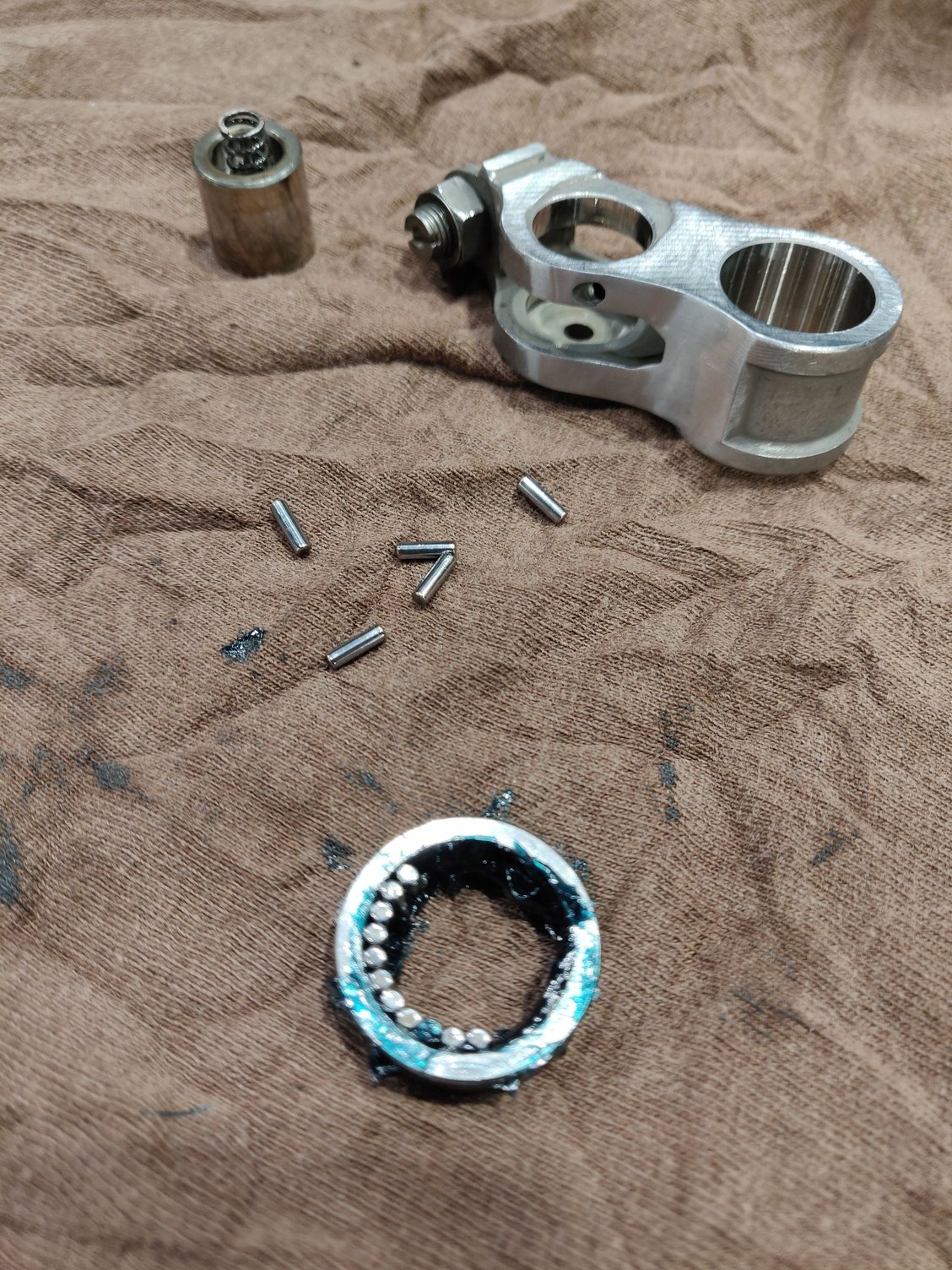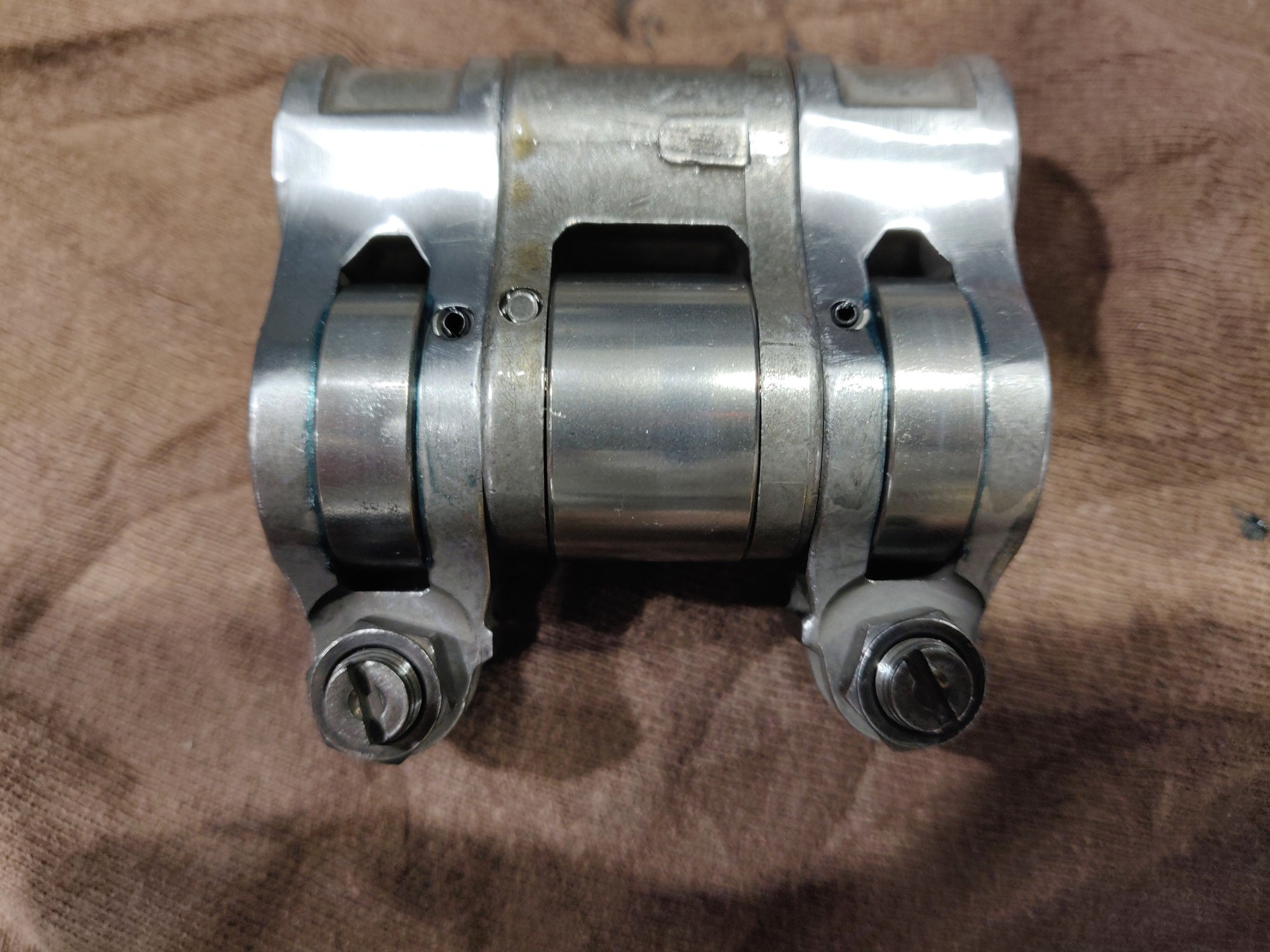 Came up with a mounting solution to fit the rollers one at a time to the Malling machine. Milled the cut out shape through the mount, this also gives you an idea of how it was bolted down. Here is the first one done and after polishing, hard to tell from the picture but it is polished. Because I had to take the rollers out to do the job had to fit the rollers back in one at a time one some grease to hold them in for re assembly All the roller bearings back in. Roller back into the rocker This is the pin that was knocked out of the ones that needed to be machined. It's the pressed retaining pin that holds the roller assembly in place. Here is the machined assembly back together with temporary roll pins holding them together, I did this for test fitting and to make sure all the math (guess work) was correct and there is no contact with the cams. Side profile. Because roll pins would not hold with engine vibrations I had to get some 2mm OD silver steel / ground finished rod to replace what was there as per OEM. This was a bit of a pain in the butt to do, this would have been easy in the assembly plant as I'm sure they would have just had a simple hydraulic setup squeezing the pin from not ends. Had to drill a bit of steel to match the shape of one end of the pin get it into place in the rocker then form the other end with a hammer and punch. Picture after forming the end with hammer and punch it's not coming out of there any time soon.