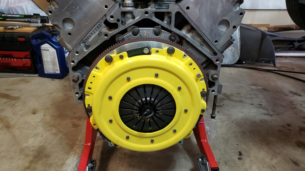 The clutch. this ended up being a two week nightmare. i could not find a clutch that would fit this flat 2 dowel flywheel. i had 2 clutches at my house an LS1 clutch and a Ram LS7 clutch. neither fit the 2 dowel pins. so i ordered a new Ram that showed it had the two dowel holes. when it showed up it was nothing like the picture and also didnt fit. so i decided to make a emergency trip to summit racing in dallas to not loose another weekend. Place is HUGE! i brought the flywheel and had them pull 4 clutches that were supposed to fit. the first 3 did not. either had no dowel holes or 3. FINALLY the last clutch they pulled, and ACT was the winner. had the 2 dowel holes and fit perfect. 6 clutches later i finally had a winner. ive never used this brand, as ive only ever seen it used on import builds. but it fit, and sorta appropriate i guess for a "honda"