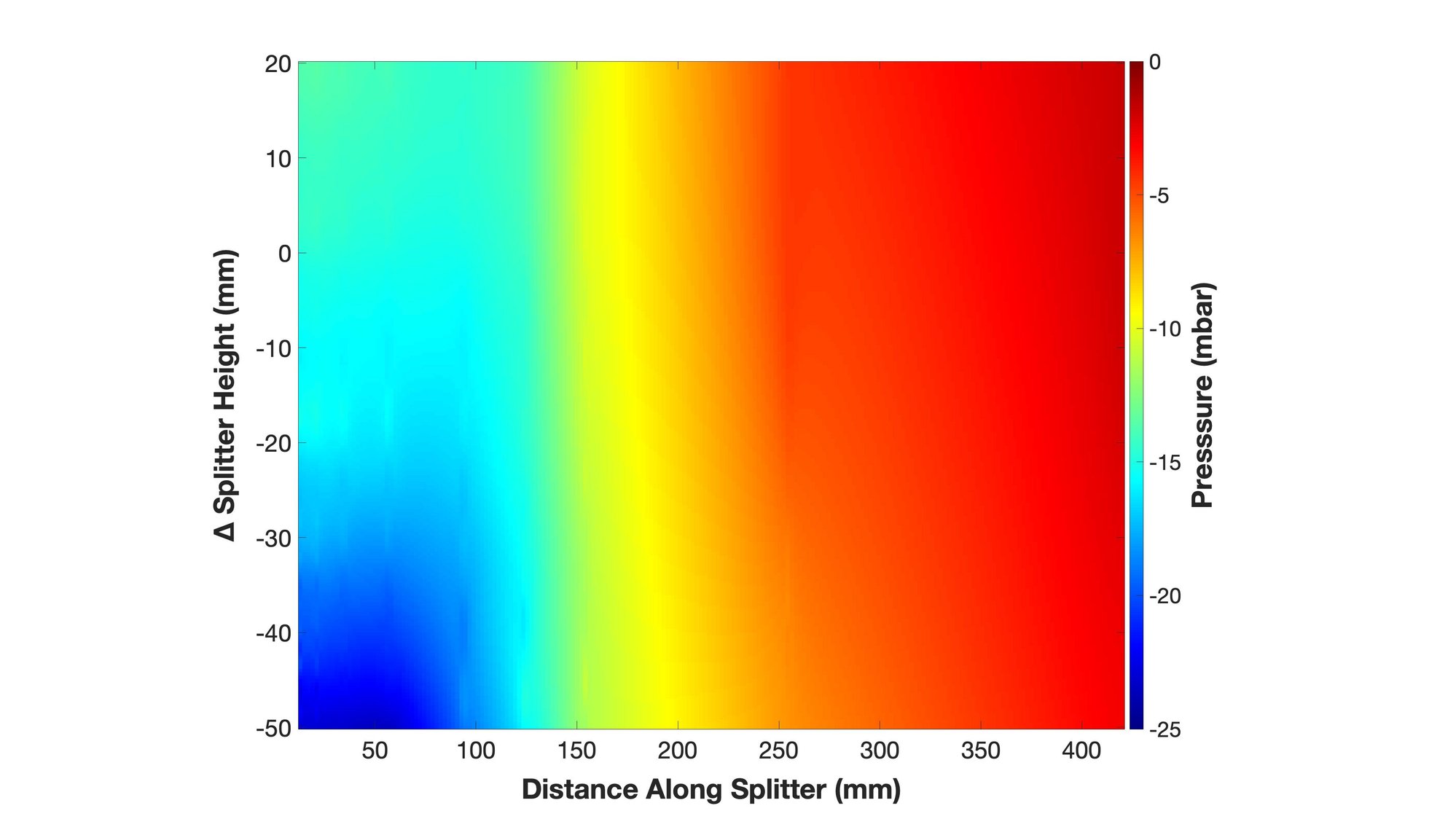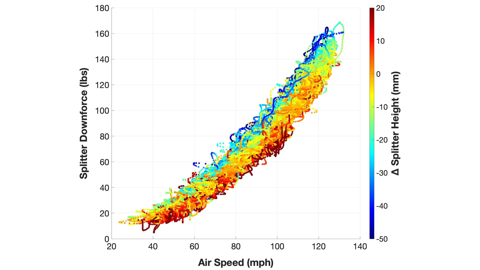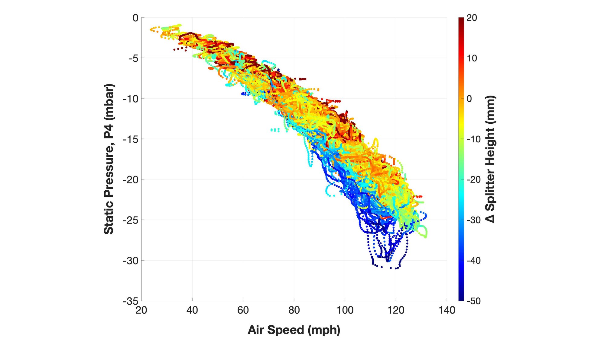 Copy. I would destroy splitters at 2". You can use the scatter plot above to see approximately how much a -1" height difference makes from 4" datum. It only looks to be about 20-30 lbs at 100mph air speed, but of course the behavior is strongly non-linear when the splitter approaches the ground.