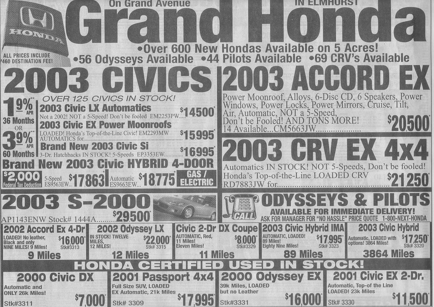 Haven't updated my posting info yet, but I just picked up my '03 this week from Carr's Honda in Chicago. $ 30,076 out the door. That Grand ad is a better price, but my experience was easy and hassle-free. Talk to Russ Anderson or Larry Hernandez. Don't recall reading anything about Grand, but you guys may want to do a search on that name to make sure they are not whistlin' dixie.