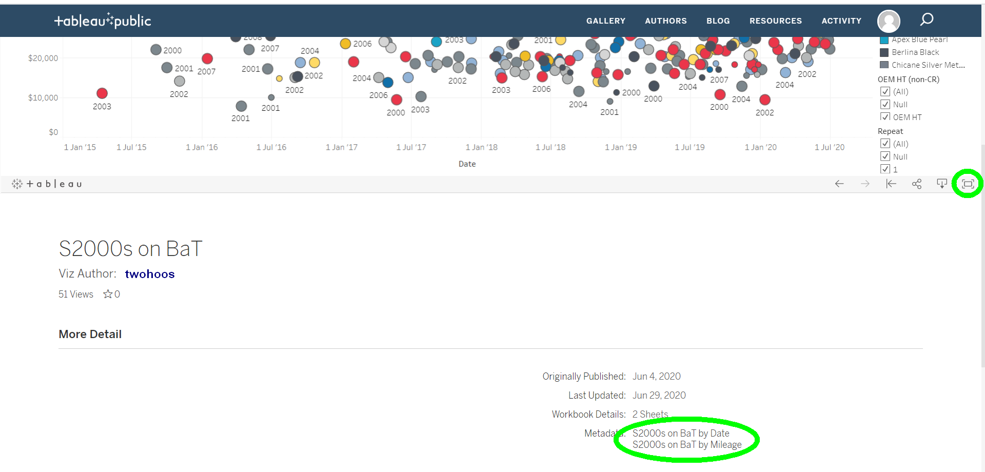 Large circles are successful sales, small ones are "Reserve Not Met" (RNM). Note that the legends on the right all act as filters/highlights: this allows you, for example, to show only CRs, or only Sebring Silvers, or (with the mileage slider) only those cars with between 30K and 50K miles. One filter that might not be self-explanatory is "Repeat": this captures the 9 or 10 cases where the same car was auctioned twice on BaT; like "repeat home sales", these items are often considered the best indicator of how the market is moving. A "Repeat" value of 1 is the first time the car auctioned, and 2 is the second time. (There've been no three-peats yet!) In the Repeat filter, just un-select the "Null" value and you'll see only these examples.