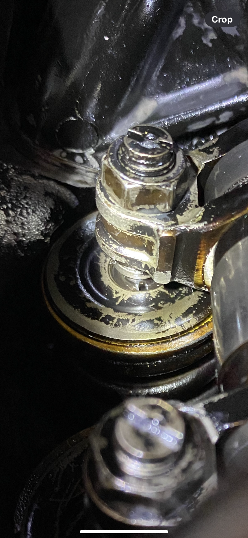 From what I could see, the keepers don’t seem to be sunk much, and the valve stems sit higher than the retainers when viewed with a mirror. However, I’m not sure if the retainers are cracked, and the inside of the engine is covered with deposits, which makes it even difficult for me to make a confident judgment.