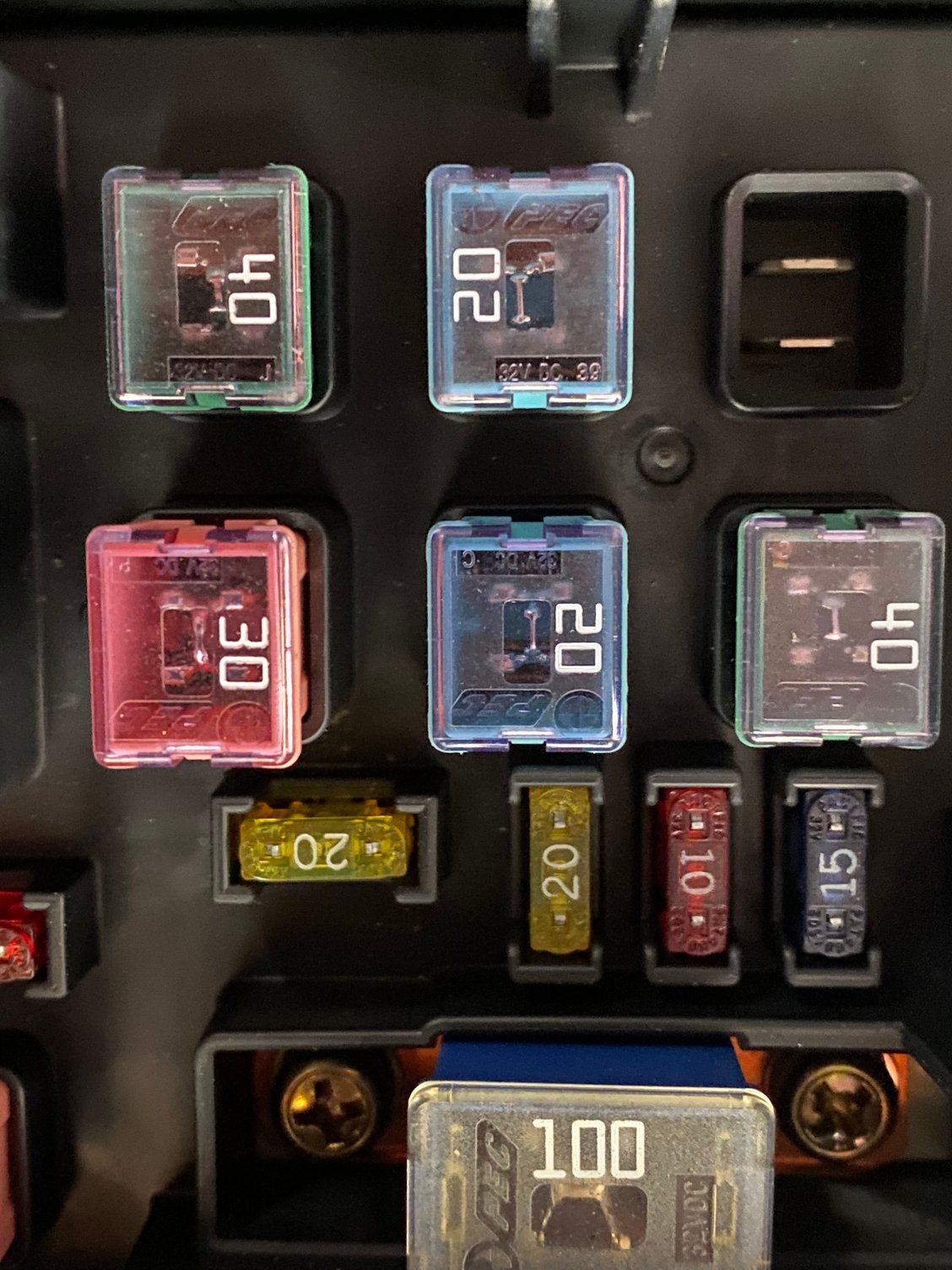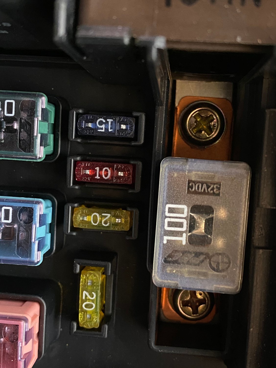 Also, while those fuses most times will show clear visible signs if they are bad, they do not always. They are best checked with a meter or a test light. You can get a test light for very cheap (grounds on one end, probe end for power) and you should see voltage on both sides of those terminals. The two main fuses are very easy to find in that fuse box. They are labeled Ign Main and Battery I think. They are in the lower center and right hand corner looking at it with the label right side up