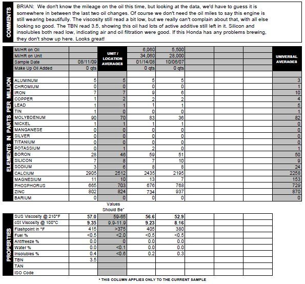 An update. This last one is from a load of Castrol Syntec 10w30. I must've missed filling out the oil interval section when I had it analysed. The total mileage was at 74,672, but the oil was in there a relatively short 4,887 miles. I changed it out when the Maintenance Minder was around 10% versus normally running it down below 5%. Driving habits still the same as before as well.