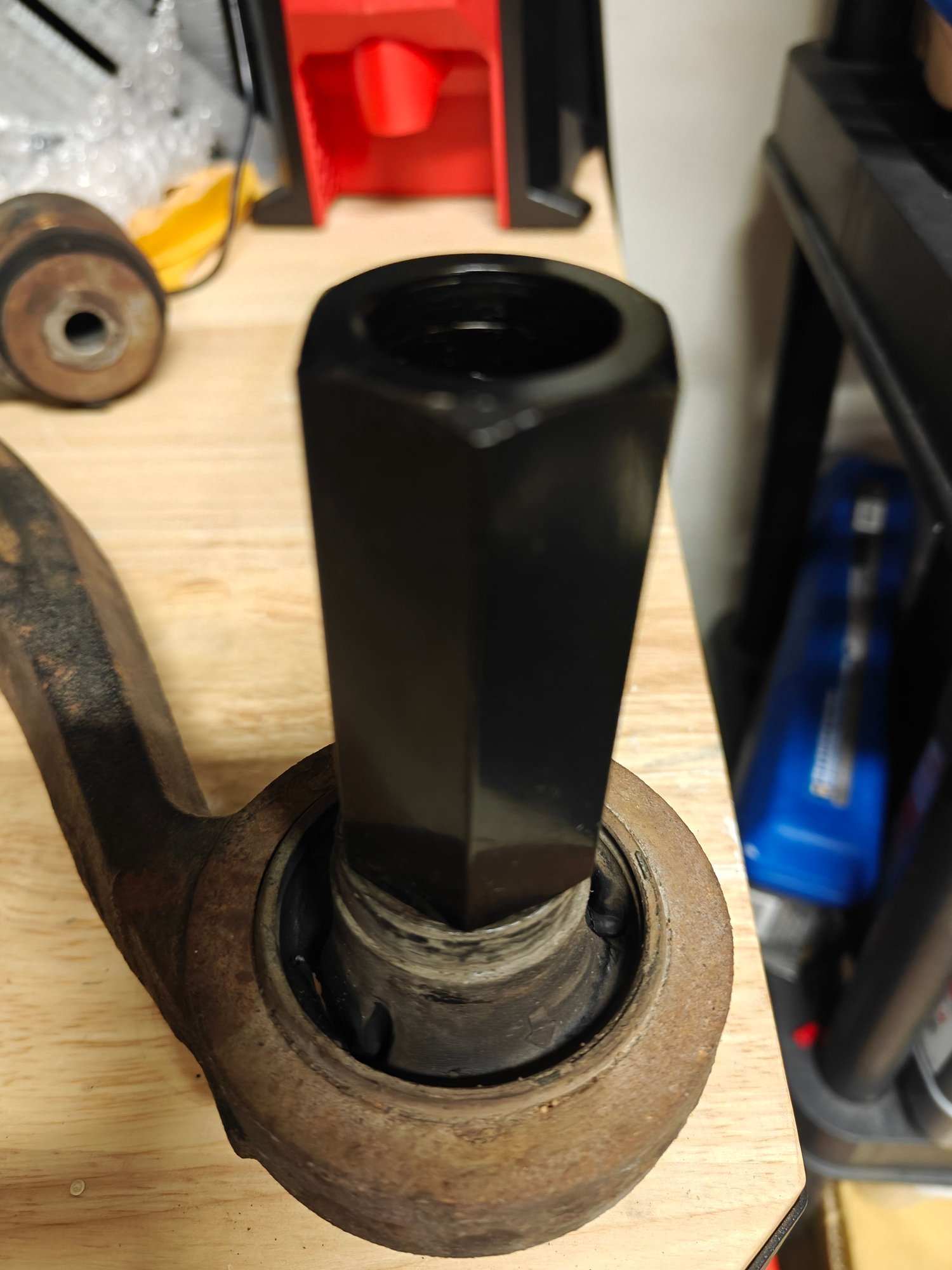 The problem is that this particular bushing has that centre shaft/whatever, which makes it impossible to just use the adapter plate to remove/install it obviously. I need a cup/sleeve of that size but don't have one.