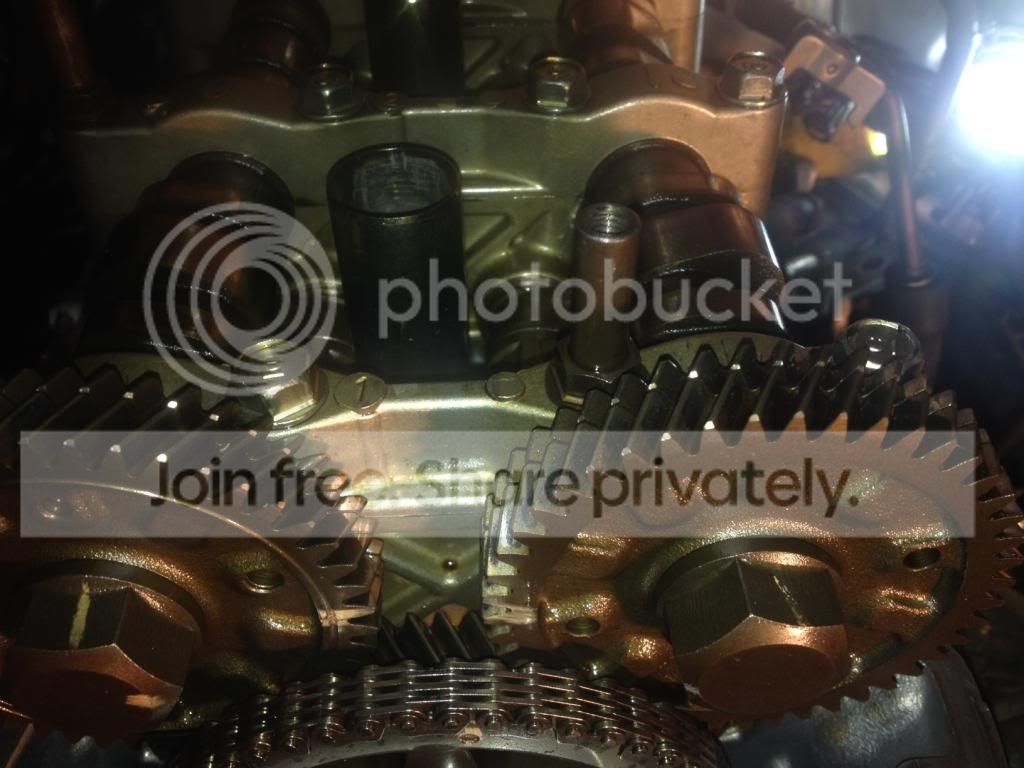 As the topic describes.. Can you fellas please take a look at these photos and tell me if my timing is on or off? I'm exhausted and new to this.. I just put a refurbished head on my car +my cams and caps and what not, and I don't want to go any further with the rest of the process until I get this tackled. The lines on my cam gears are really weird and have a marking over them... It makes it hard for me to tell. Thanks guys!