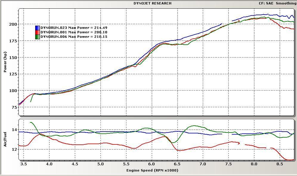 I finally downloaded the DynoJet Runviewer, so I created a new plot of my engine before tuning my V-AFC (Red), after tuning my V-AFC (Green), then after installing the wideband AFC (Blue). I did lower my VTEC engagement before tuning the V-AFC, but that didn't have too much effect on the results.