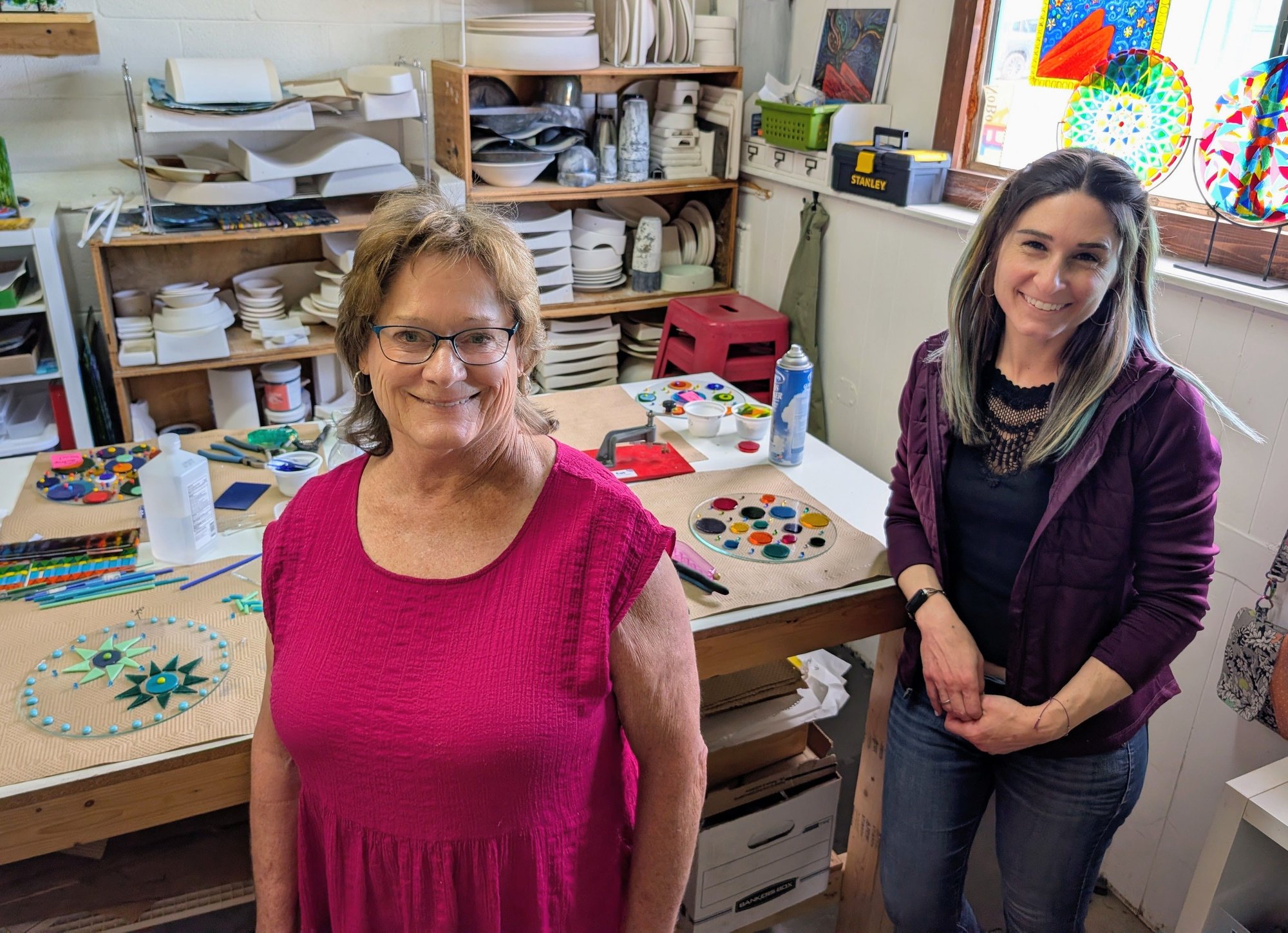 ^3-29-2026. My daughter and me in Boulder, standing next to our completed melt glass projects.