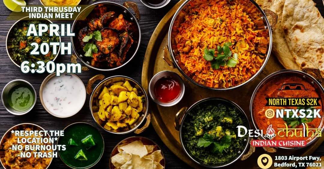 North Texas S2K heads to a new restaurant and food genre for our April meet. Desi Chulha Indian Cuisine is sure to please anyone's itch for some of that good Indian spice. Meet at around 6:30PM or so for some S2K hangs and some tasty Indian food. See everyone at Desi in Bedford!