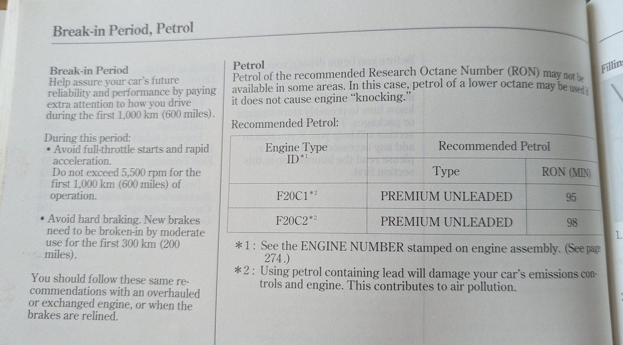 Just to confirm, yours also has an F20C2 engine and 98 RON on the fuel door, right?