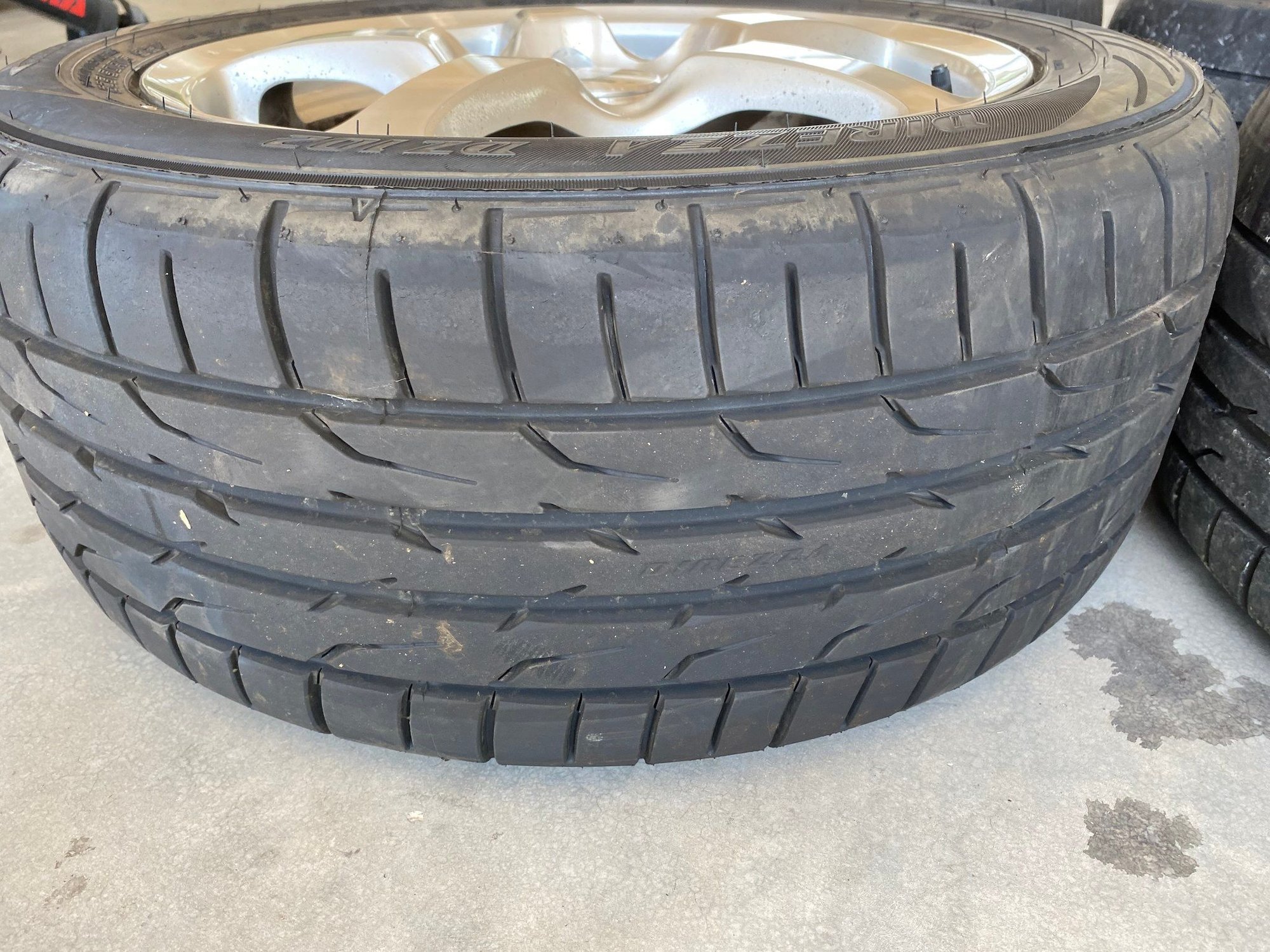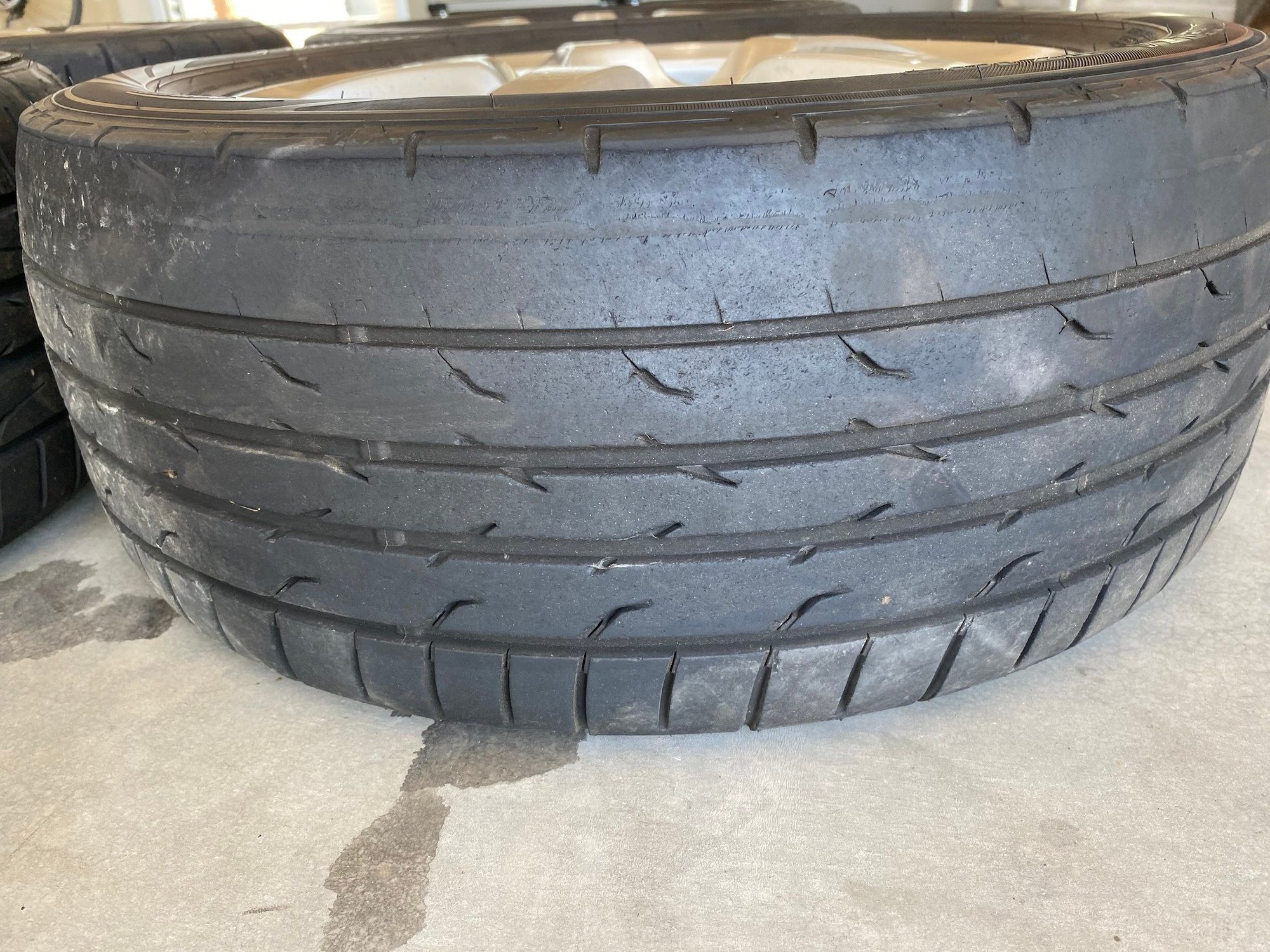 Rear tires have almost no wear. Fronts are at about 60% with high edge wear from high camber. There were flipped so the worn edge is on the outside.