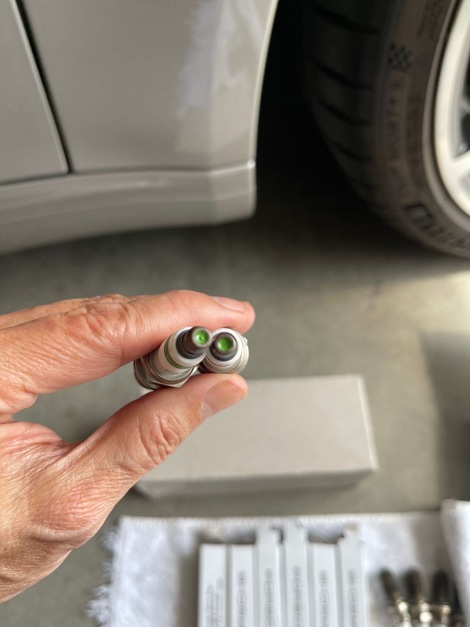 Looking at these old plugs, I don't believed the dealer replaced them during the first major service. The green tip usually indicated it was factory installed.