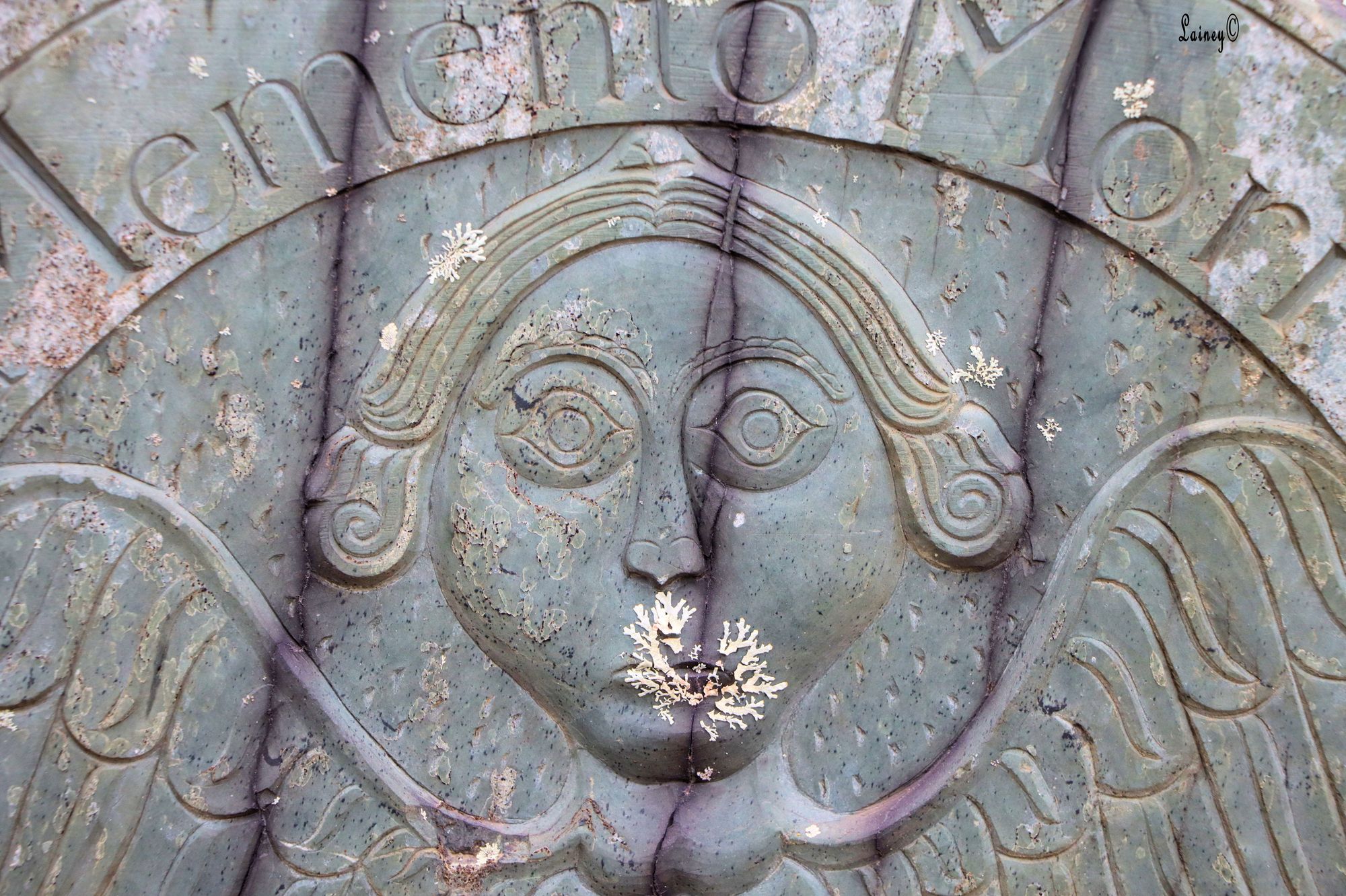 Old interesting grave stone. The lichen over the mouth area made it more interesting to me.