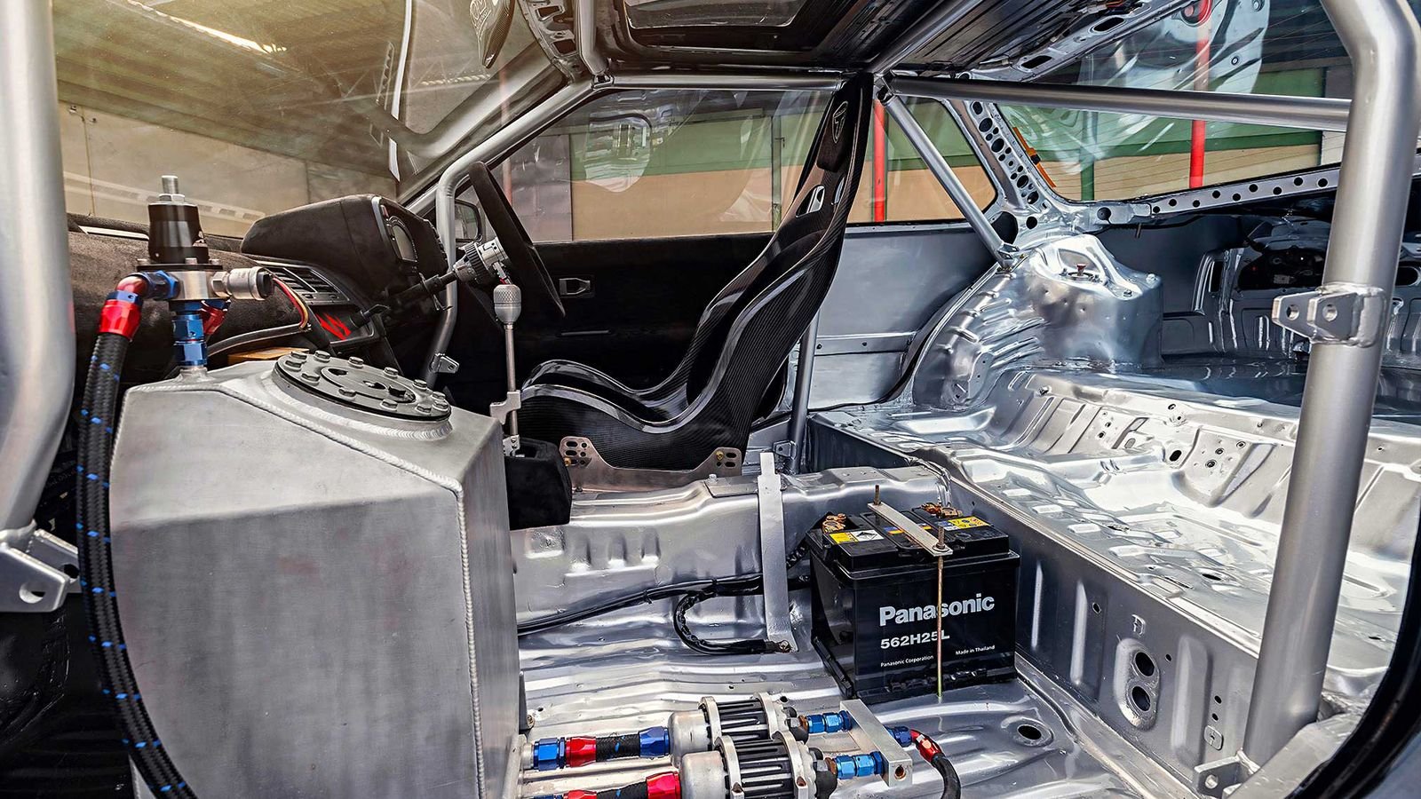 Other than a couple of mutations in the hood, a beautiful stance, and the custom wheels, the exterior is pretty much stock. The interior, however, is a totally different story. In true competition car fashion, nearly everything has been stripped out. The driver seat has been replaced with a carbon-fiber bucket seat. A fuel cell now resides in the passenger seat area, with dual pumps and a battery. The dashboard is the only thing that remains, albeit in modified form.
